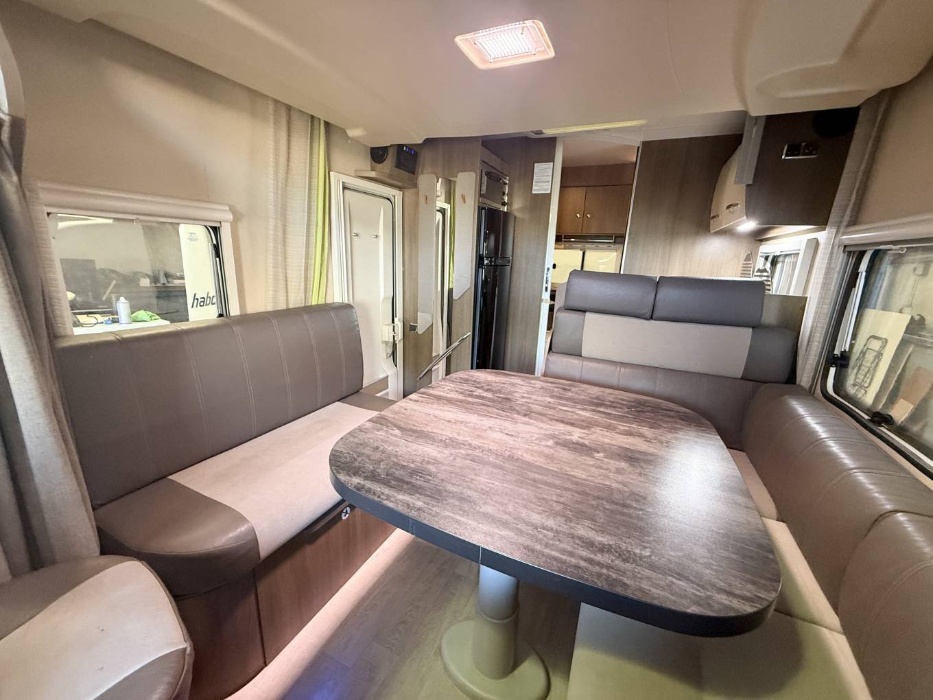 We enter the motorhome on the off side via a low step immediately to the right of the habitation door is a large two seater sofa opposite is the dinette with an L shaped sofa, the forward facing part has 2 x 3 point lap & diagonal seat belts for travelling passengers. The front two seats rotate to join this area giving a massive dining area that could easily seat 7 people while entertaining on site. The table fixed to the floor can be centrally positioned for easy access. At night the table can be dropped electrically to form the base of a double bed that is made up from the sofa cushions. Over head the main bed electrically drops down and can be accessed via a ladder.