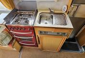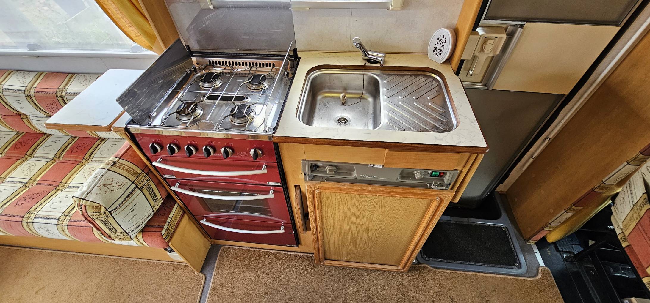 The central kitchen includes a gas hob, oven and grill, stainless steel sink, and a fridge with freezer compartment. The adjacent washroom features a cassette toilet, washbasin, and integrated shower.