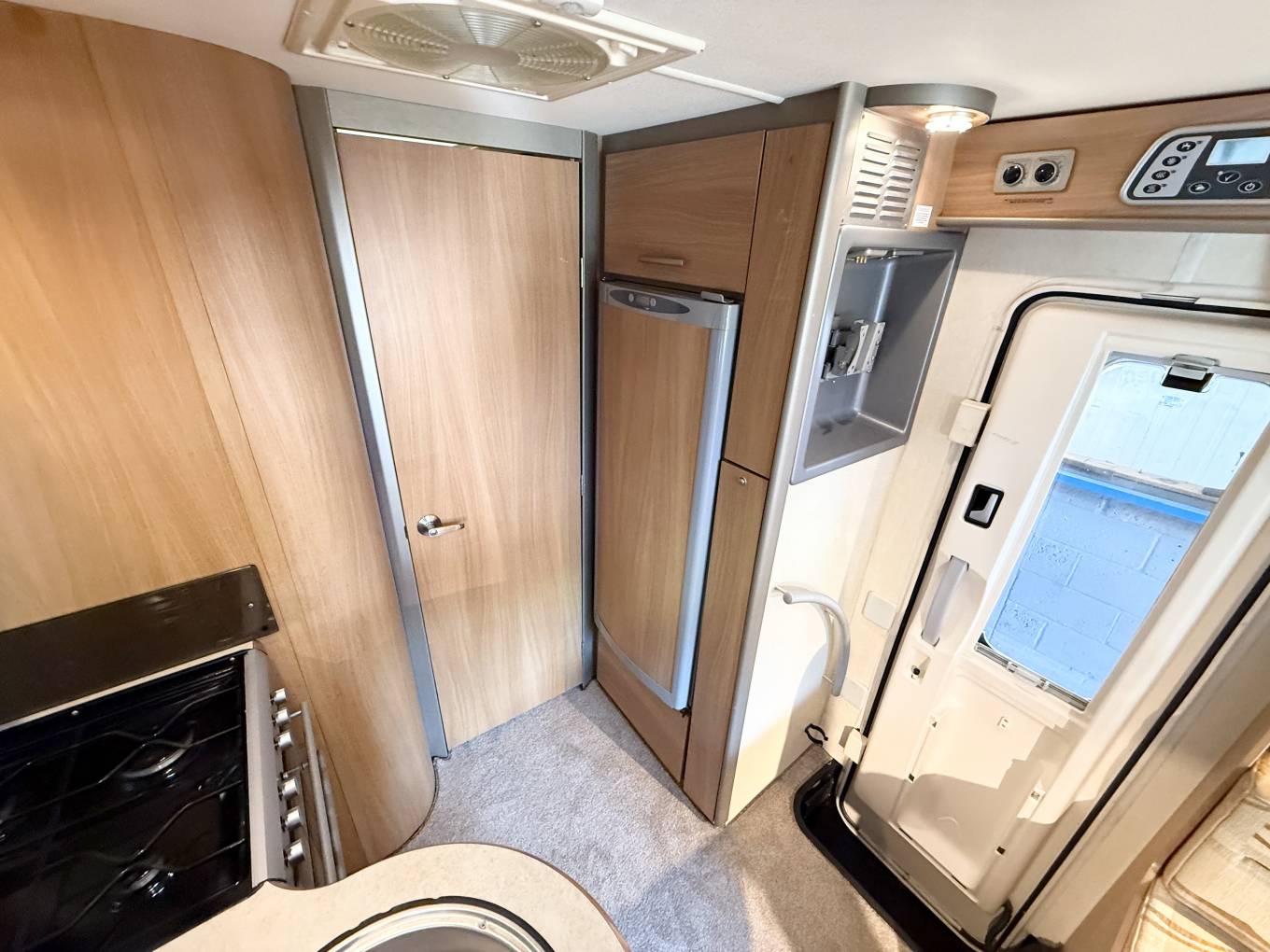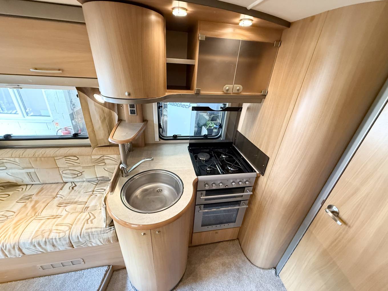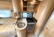 The Kitchen opposite the Habitation door consists of a sink with chrome mixer tap; black enamel 4 burner hob, 3 gas and one 240v hotplate for when you are plugged in on site. Above there is a Microwave and plenty of cupboard space for all your cooking utensils & holiday provisions. Below the counter is a full size Thetford Oven with grill. Opposite a large Thetford absorber style fridge with separate freezer box this can be powered by 240v, 12v or gas depending whether you are on the move or wild camping.