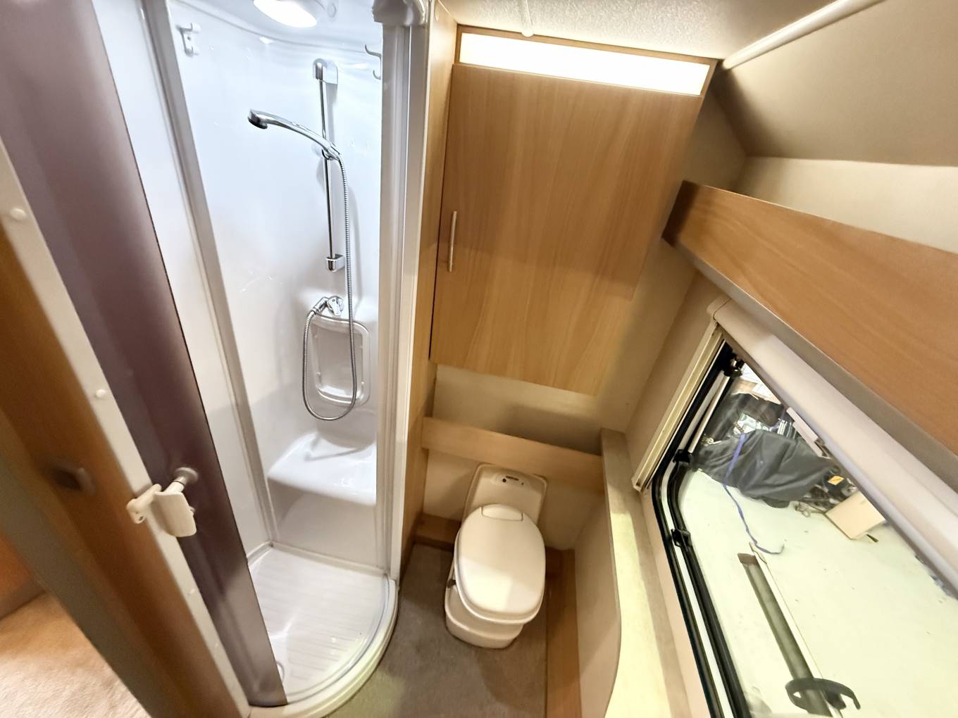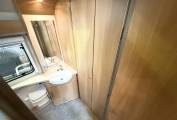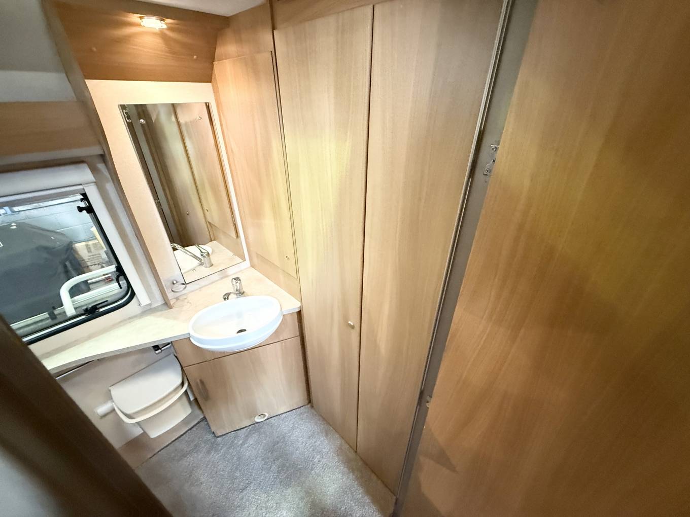 Next to the fridge is a large hanging wardrobe with drawers below. Finally to the rear is the full width bathroom which consists of: cassette style Thetford electric fresh water flush toilet; central white sink with chrome mixer tap; large hanging wardrobe with drawers below; separate shower cubicle with Perspex doors to close.