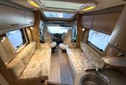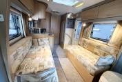 We enter the motorhome on the nearside and immediately to the left is the dinette which consists of two opposing sofas. The table stows away when not in use & the front chairs also rotate to join this area, so you could comfortably seat 6 if entertaining on site. At night this area pulls together to make a large double bed using a combination of cushions as the mattress. Alternatively it can be used a twin single beds by using a sculpted infill cushion for the shorter of the two sofas and the passenger front seat.