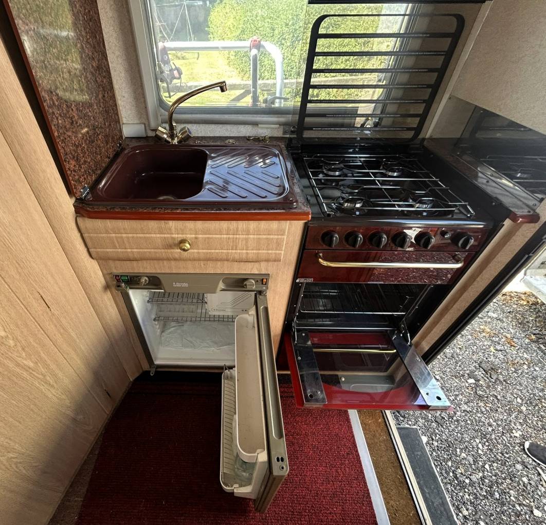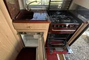 The kitchen is located to the rear and is very well appointed with a 4 gas ring hob, a separate oven and grill, sink with mixer tap, additional drop-down work surface and fridge with small freezer compartment.