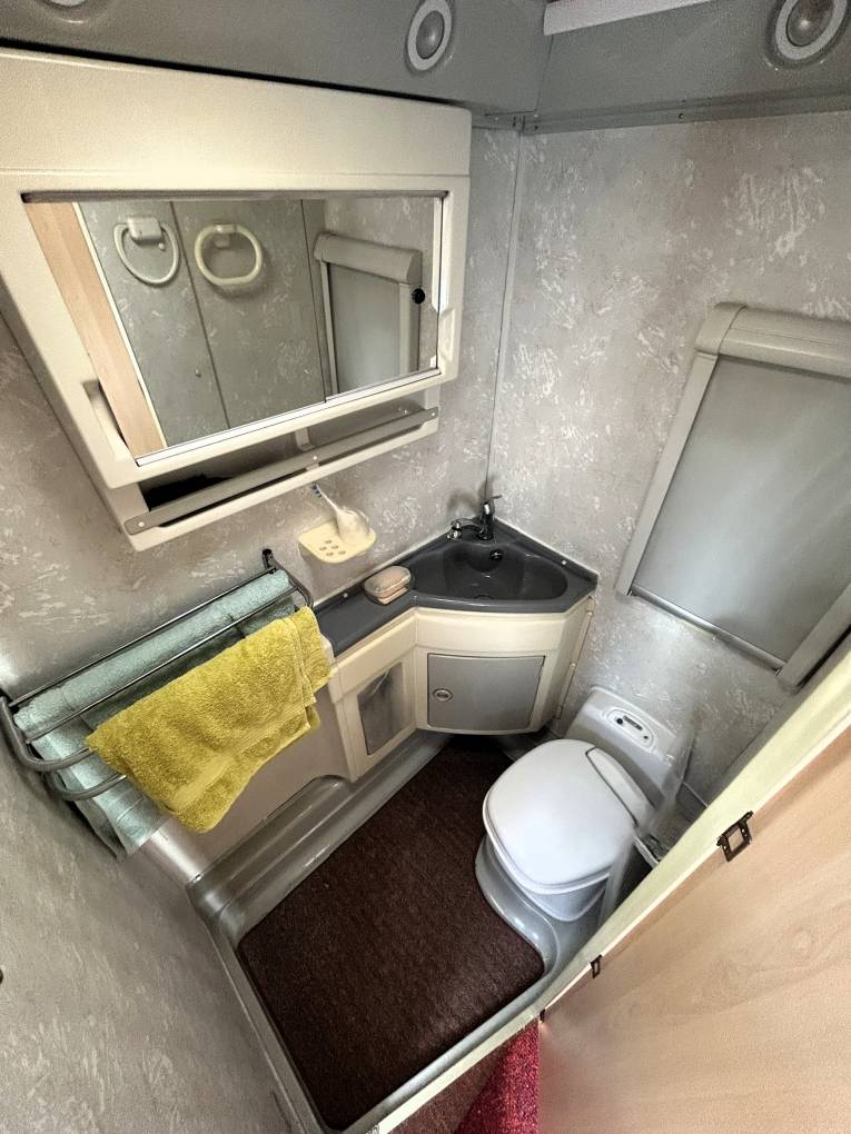 The washroom is situated adjacent with washbasin and shower head, vanity unit, cassette toilet and storage unit.