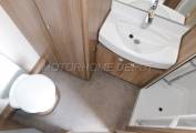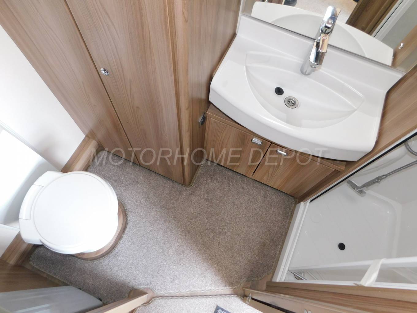- Enter the van & the end washroom is immediately to the right, white designer washbasin & chrome mixer tap, Thetford cassette swivelling toilet with electric flush, separate shower cubicle with folding shower door. Storage cupboard & very large double door wardrobe with hanging rail & shelving.