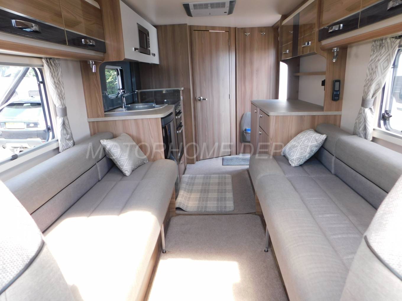 - The lounge has two parallel side sofas that can be used as single beds or pulled together to make a very large double bed, large side windows & sunroof provide plenty of natural daylight. A wall mounted TV bracket, large dining table stored in a dedicated locker, both front seats swivel to face the lounge. Upper aircraft style storage lockers & under seat storage available.