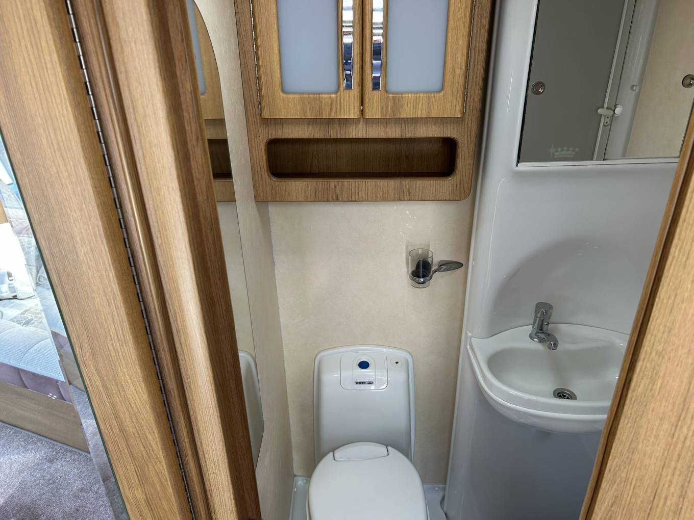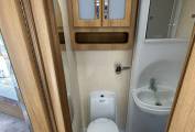 Next is the washroom with a shower, cassette toilet, hand basin, small storage cupboard and mirror. To the left of the washroom there is spacious wardrobe.