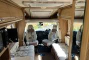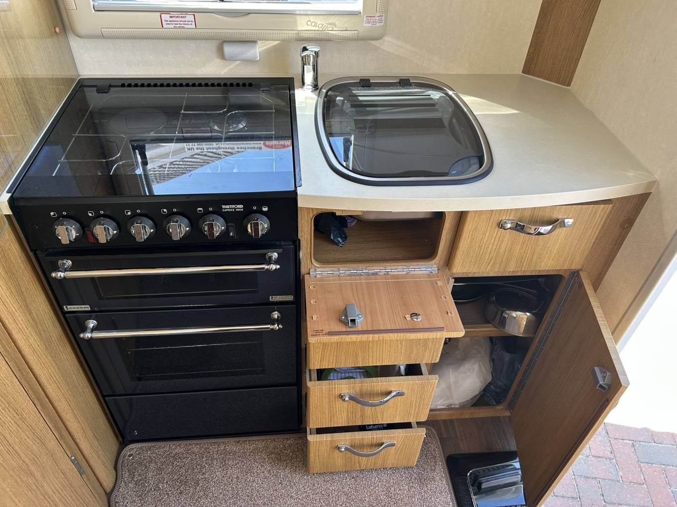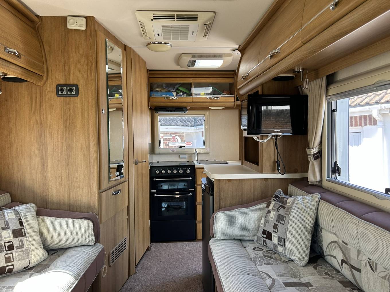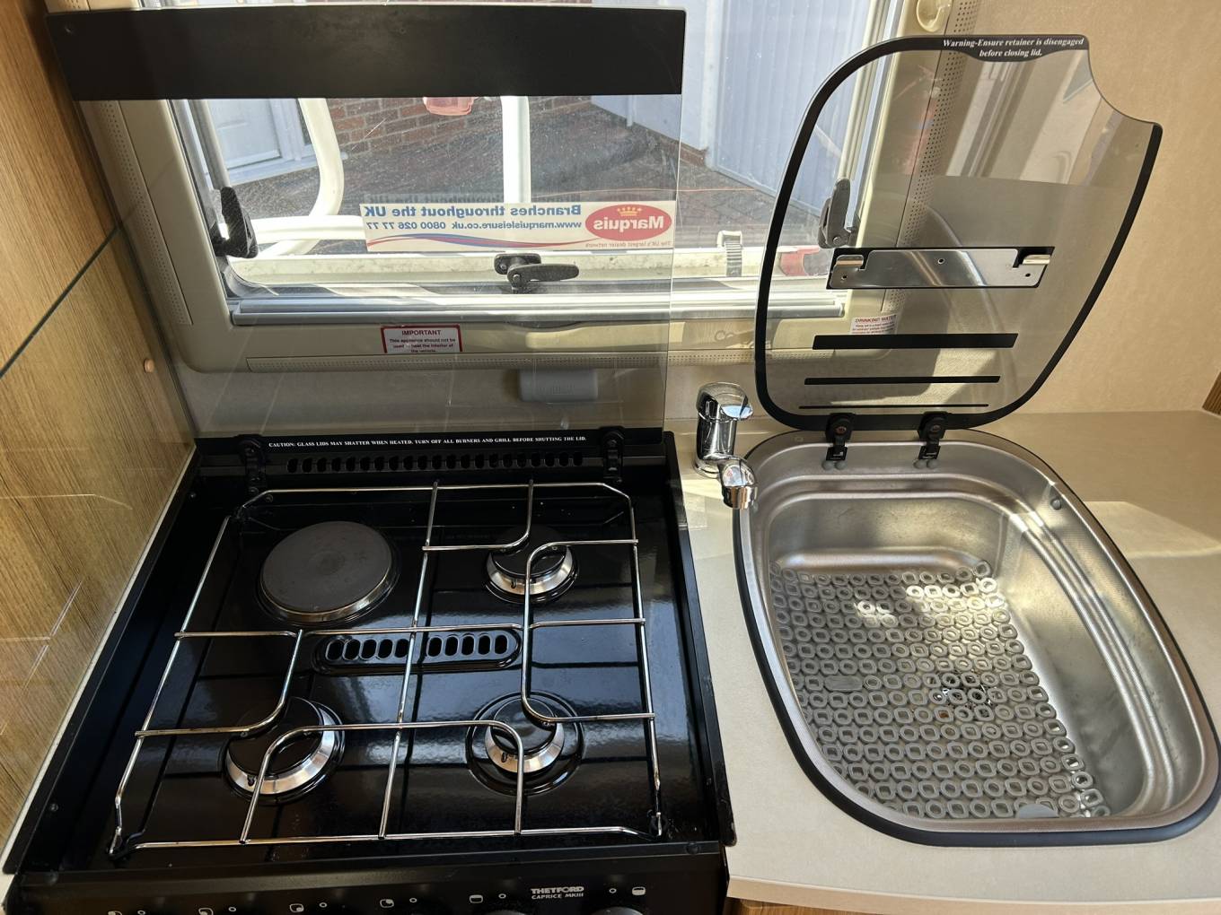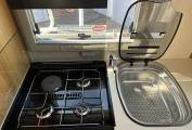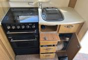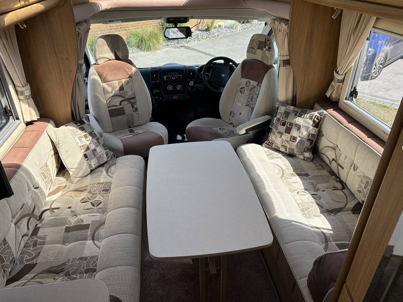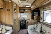 As you enter the van you will find a well equipped kitchen, comprising of a fridge, oven with grill, dual fuel 4 ring hob, extractor fan, sink with mixer tap and a microwave. There is plenty of cupboard and drawer space for all your kitchen essentials. There is a small work surface with place to put glasses and a cupboard above.