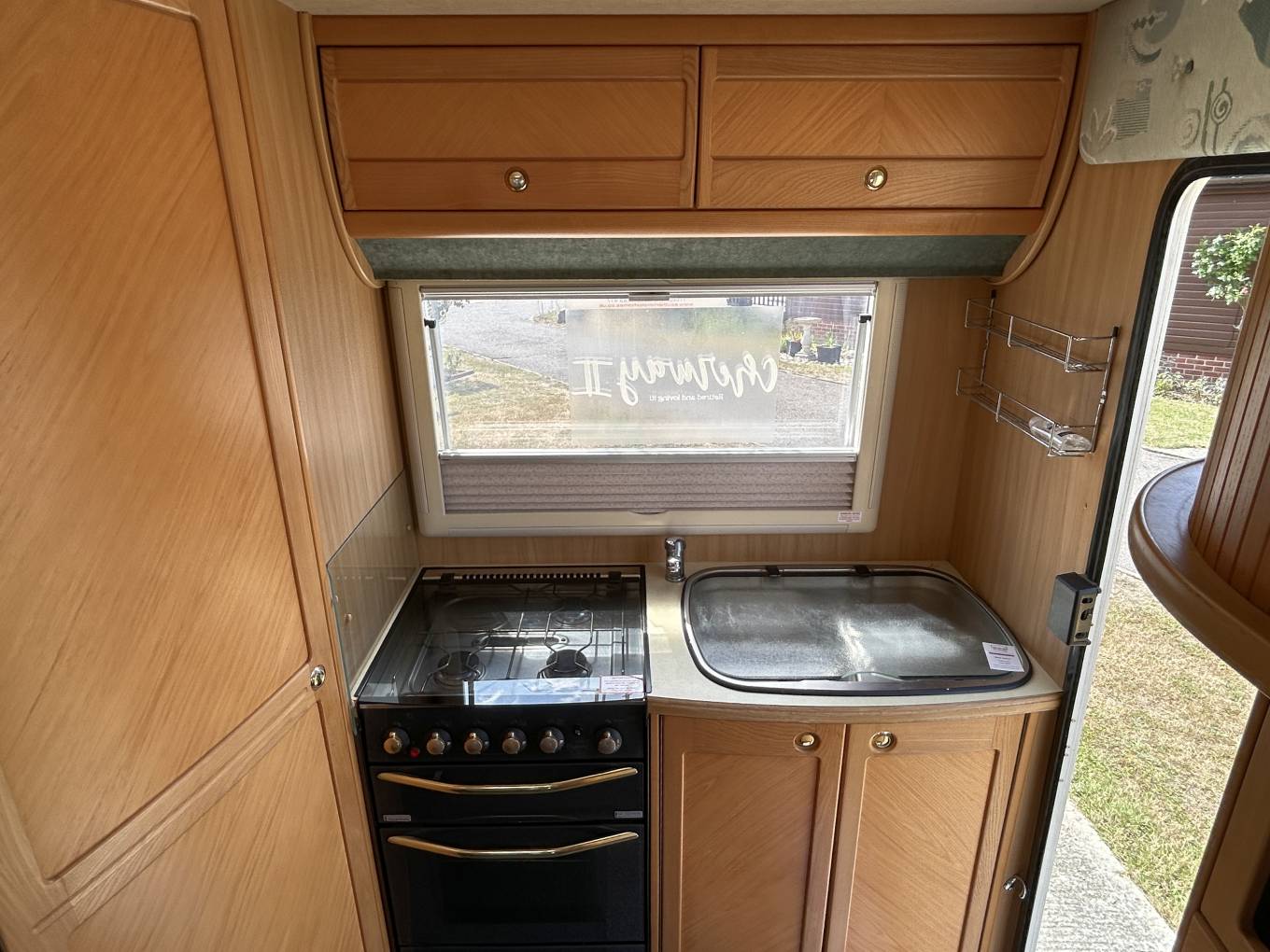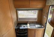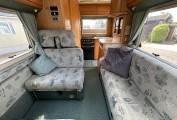 Step inside, and you’ll find a well-designed interior with a rear kitchen, perfect for preparing meals on the go. The dual-fuel hob features an electric hotplate and 3 gas burners plus there is a gas oven and grill.