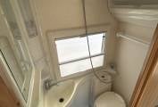 The washroom includes a shower, a Thetford cassette toilet, a wash basin with a mixer tap, and two storage cabinets for toiletries.