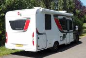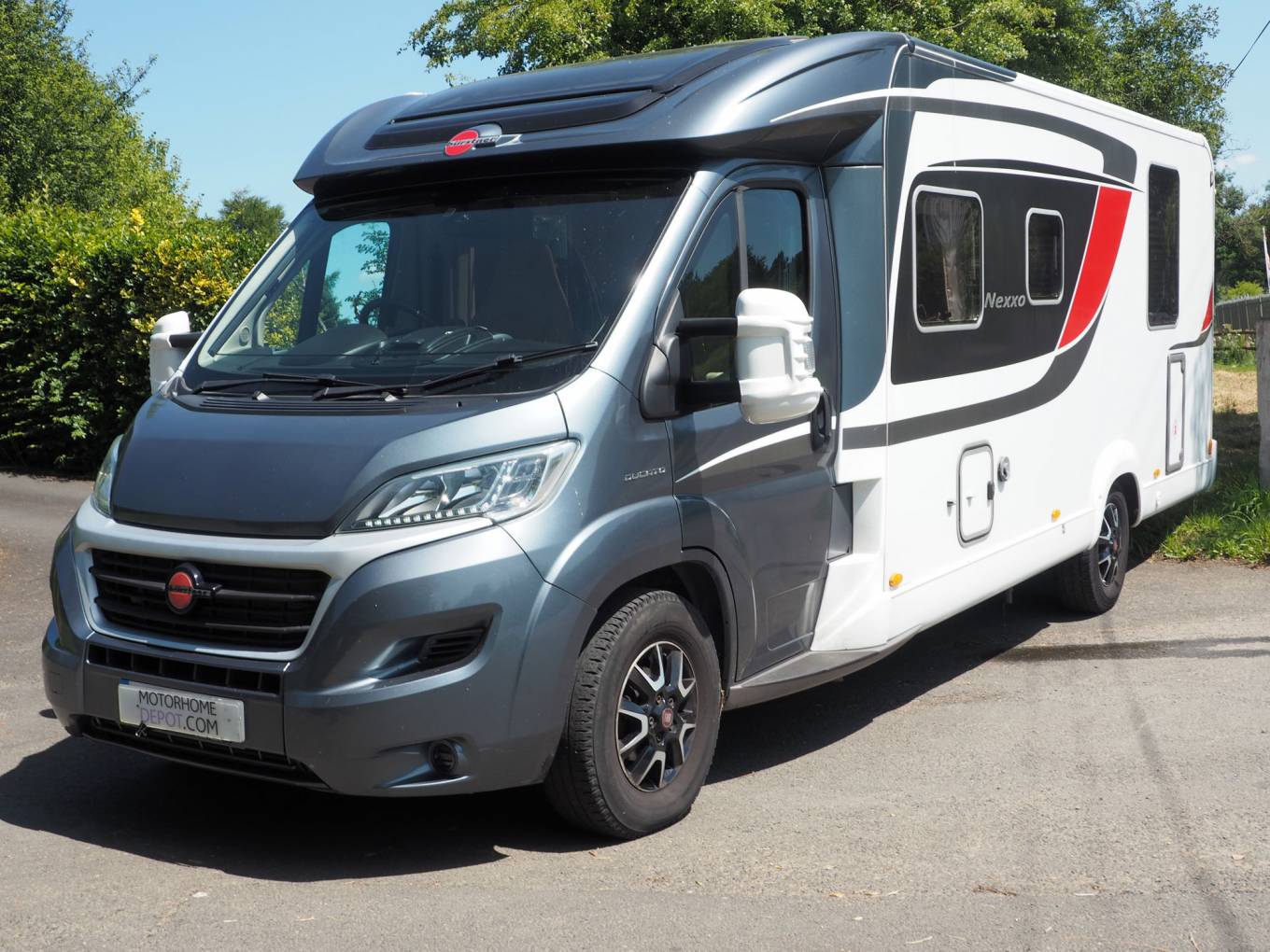 Excellent design on this attractive and well equipped automatic Burstner, the 7.5 metre Nexxo 740 employs a tried and tested layout of rear island bed over a low garage, centre washroom, changing area and kitchen, forward dinette with swivel cab seats, giving three clearly defined zones within the motorhome. This vehicle has 4 x 3 point seatbelts and has been plated at 3500KG so can be driven on a standard car licence. Nexxo Sovereign is the mid range from Burstner, offering stylish visuals, quality furniture and fittings, with a good standard of equipment. Extras included in the sale are refillable gas bottle, awning, hook up cable, filling hose, 2 TVs.
