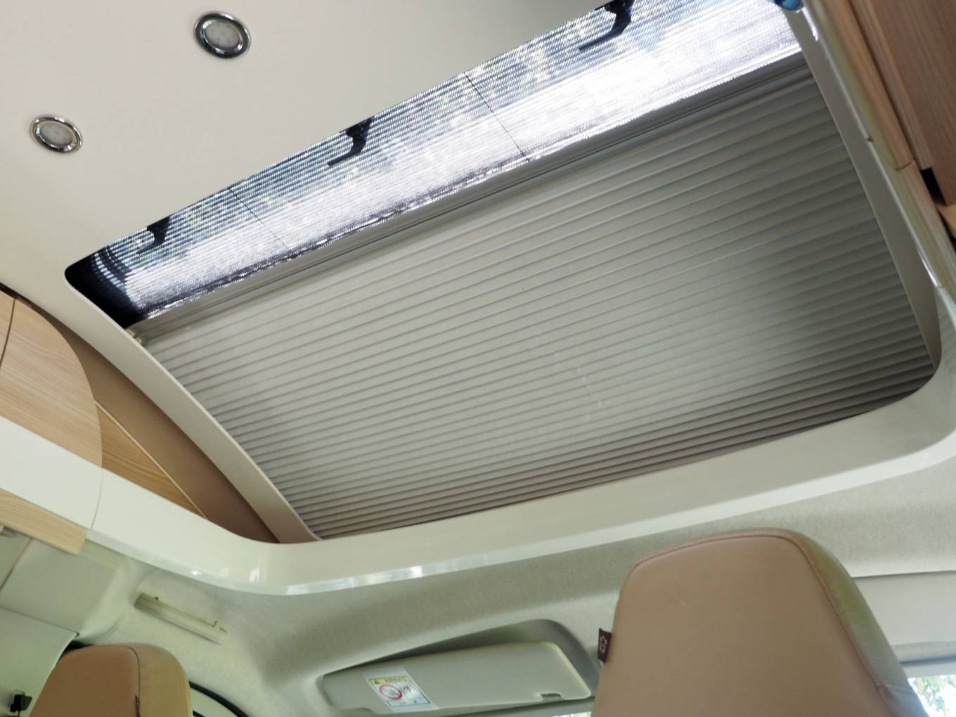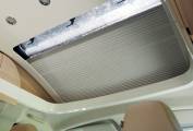 The bedroom and washroom area has a solid partition and there are blinds and flyscreens throughout, including integrated night blinds to the cab glass. With the cab seats swivelled, up to 5 can sit in comfort for a social and there is a pull out section for third passenger legroom, plus the table can be extended easily. Plenty of light and air here too, thanks to the large opening rooflight and forward sunroof. A concealed TV drops down behind a locker for easy viewing and there is another TV in the rear bedroom.
