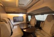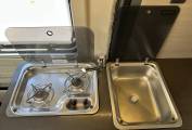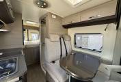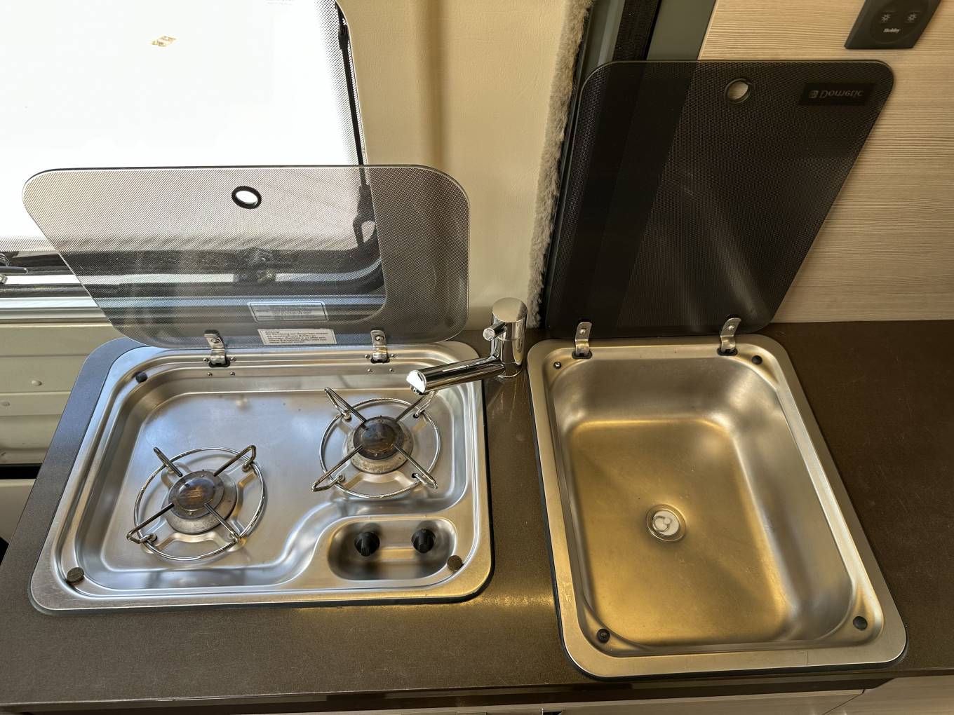 The Hobby Vantana packs one of the most popular layouts found on larger motorhomes into a 6.4 metre van conversion. There are three clearly defined zones, with the lounging space at the front, kitchen in the centre with washroom adjacent and to the rear a fixed double bed area. It’s a tried and trusted setup, nicely executed and adaptable for two or more thanks to four seatbelts and an occasional bed available from the forward dinette, which can seat four for a social gathering.
