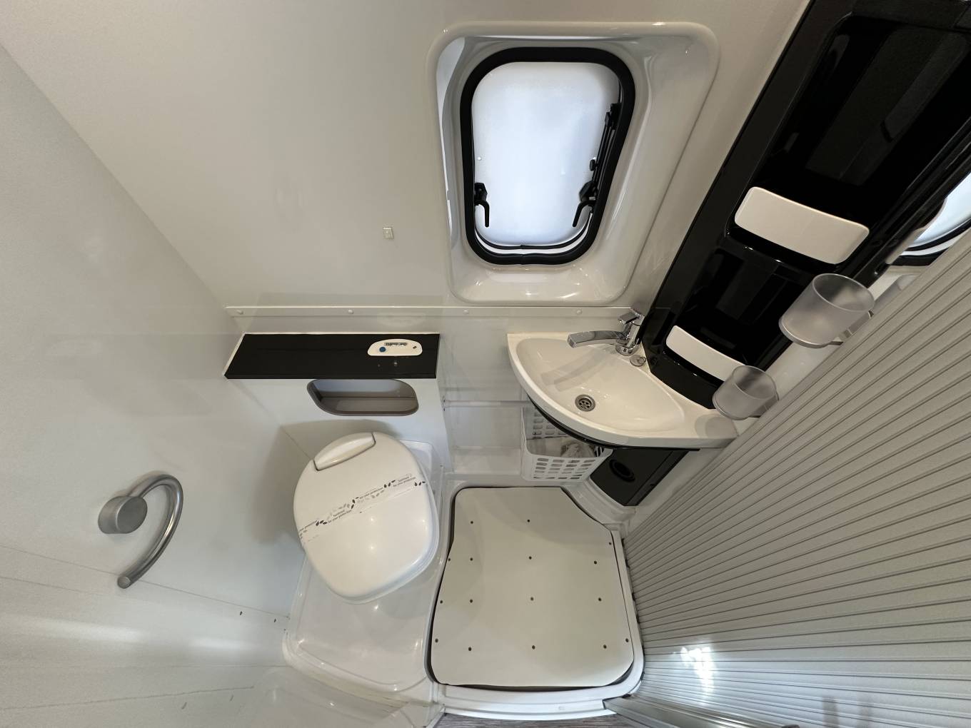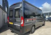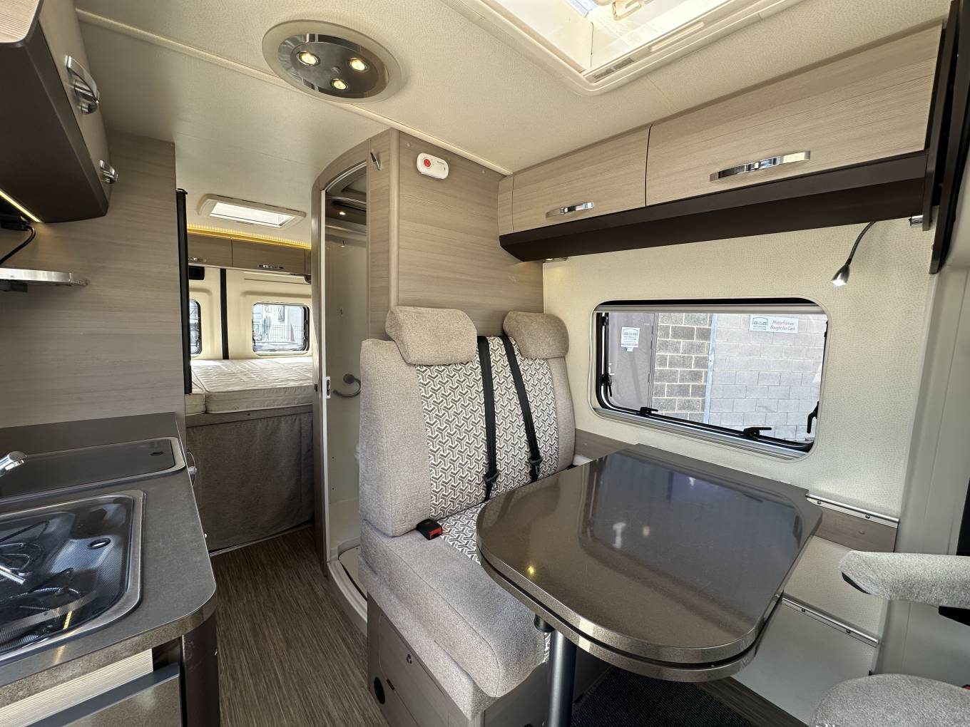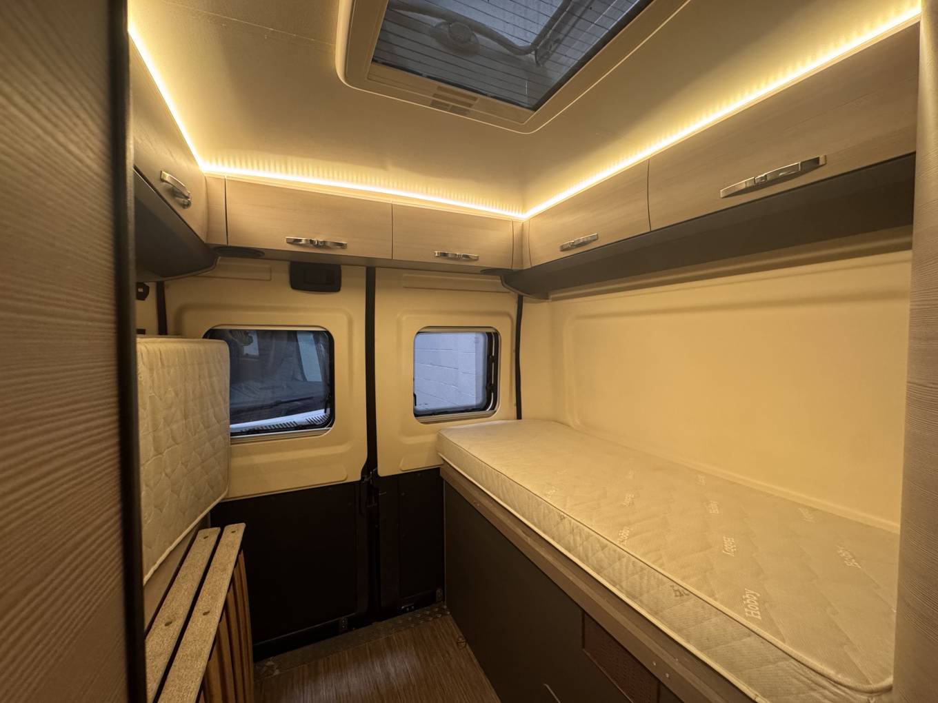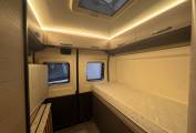 Midship the kitchen features a good array of soft close storage drawers, two burner hob, sink with mixer tap, side work surface extension and fridge with freezer compartment. Adjacent to the kitchen is the pristine washroom which features an ingenious shower enclosed by tambour doors, plus toilet and vanity sink. Onboard services include fresh and waste water tanks, Truma dual fuel heating and hot water. No space is wasted with lots of storage pockets and lockers. To the rear is the kingsize bed which has removable bed supports for tall storage and plenty of room for everything you would need on your adventures.