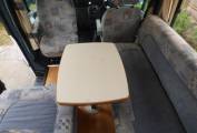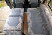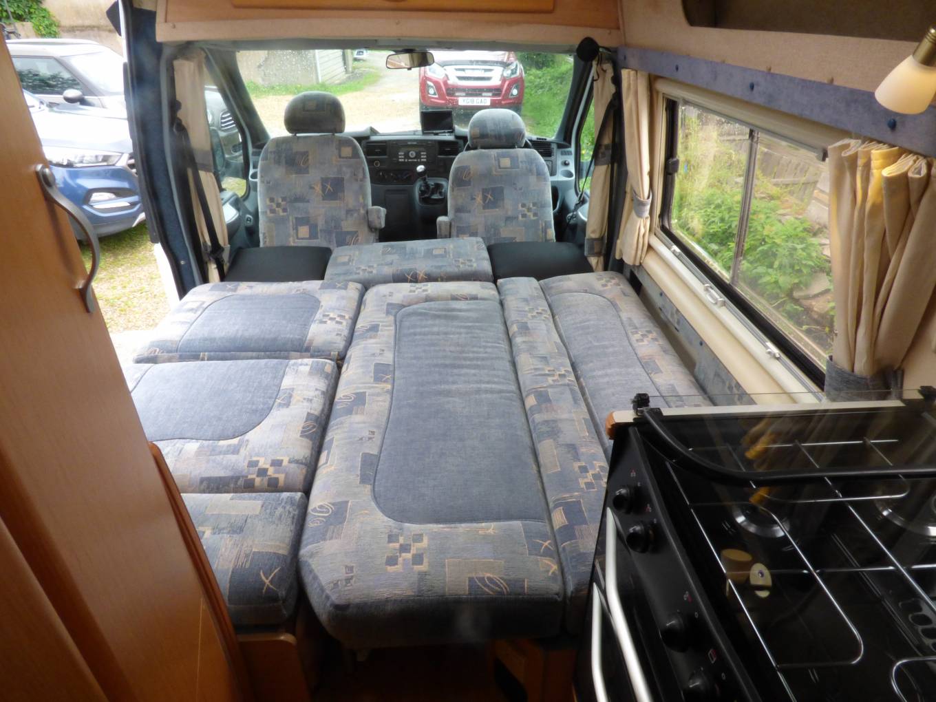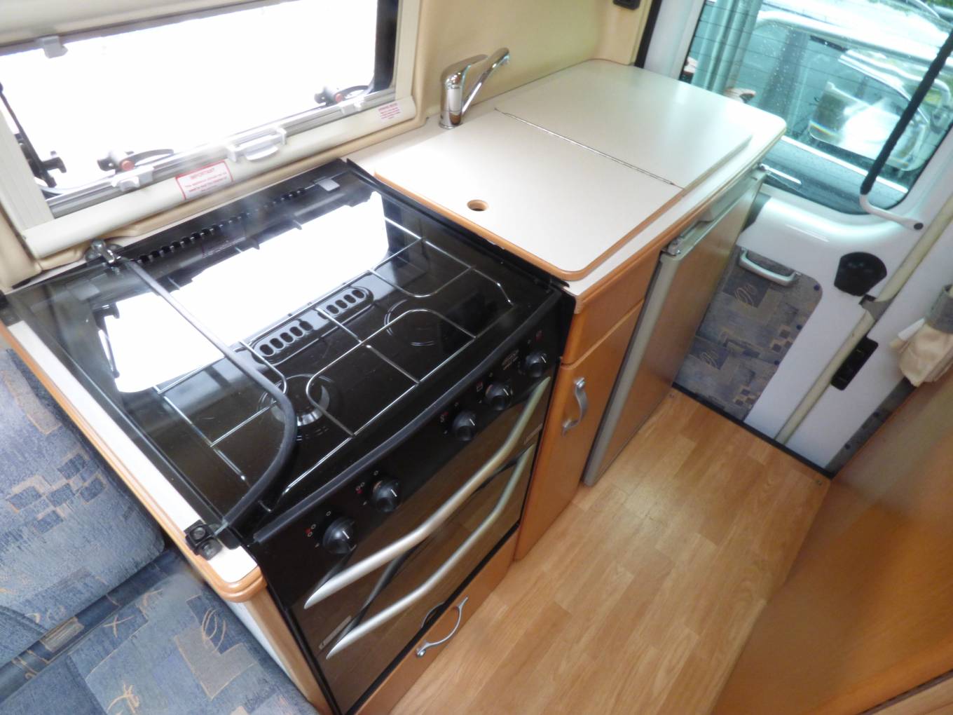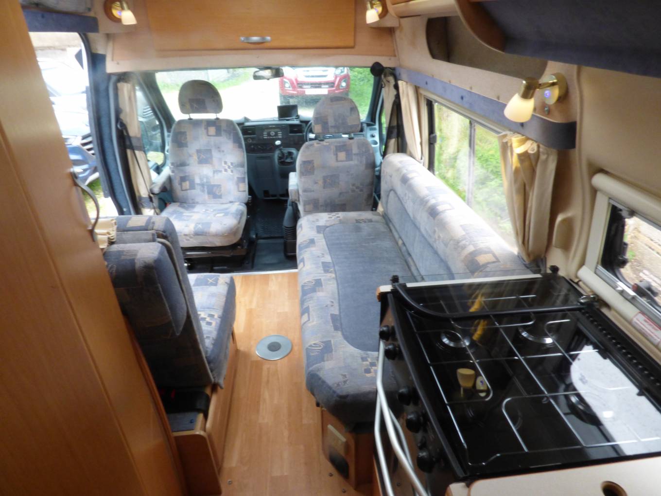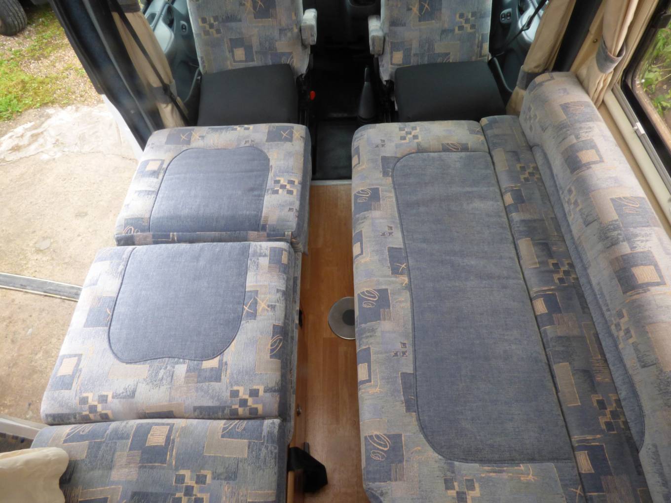 Internally the passenger seat swivels to face the bench seat and the single seat with the third seatbelt. There is a choice of two tables for dining/socialising and the bench seat/single seat together with cushions creates either the two singles or large double (72" x 67"). The washroom at the rear has a drop down sink, cassette w.c. and a shower and a panel which folds out of the door to create private space outside the washroom for dressing/drying etc. The kitchen is equipped with hob, oven and separate grill, sink and fridge. The lucky buyer will have a choice of unused carpets or the wood-effect vinyl floor and a safe can be found underneath the passenger seat..