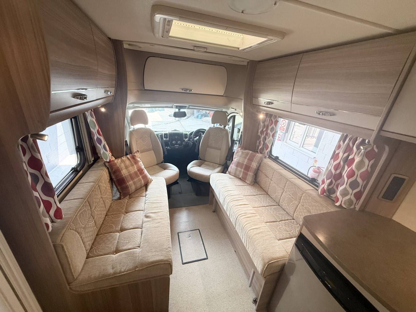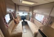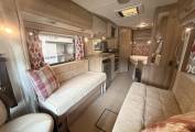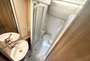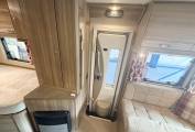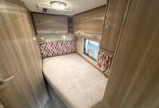 This four-berth motorhome features a popular french bed layout with also offering a spacious and inviting living area with twin sofas and large panoramic windows that let in plenty of natural light. The center benches easily converts into a double bed. This flexible sleeping arrangement, combined with the comfortable seating.At the center of the motorhome, you’ll find a well-equipped kitchen that includes a full oven and grill, a 3-burner gas hob with an additional electric hotplate, a microwave, and a good-sized fridge with freezer compartment. There’s ample worktop space and storage, making it easy to prepare meals while on the road. Opposite the bed is the washroom, which includes a cassette toilet, a washbasin and a shower.Bessacarr E450 blends functionality with refined aesthetics. Its manageable size makes it easy to drive and park, yet the interior feels remarkably spacious thanks to its smart layout and high-quality design.