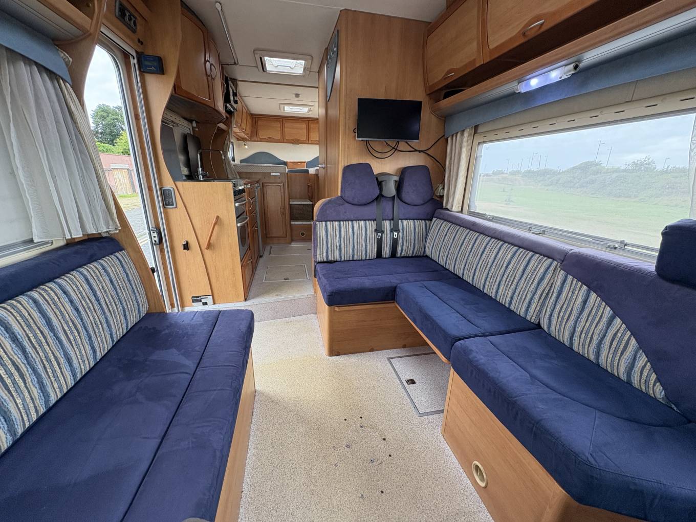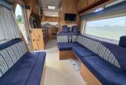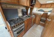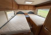Comfortable and thoughtfully laid out, with 2 fixed single beds at the rear, a drop-down over cab bed, and a convertible dinette. Well-equipped kitchen featuring an oven, grill, hob, and fridge. Swivel front seats turn the cab into a sociable living area. Ample storage throughout.