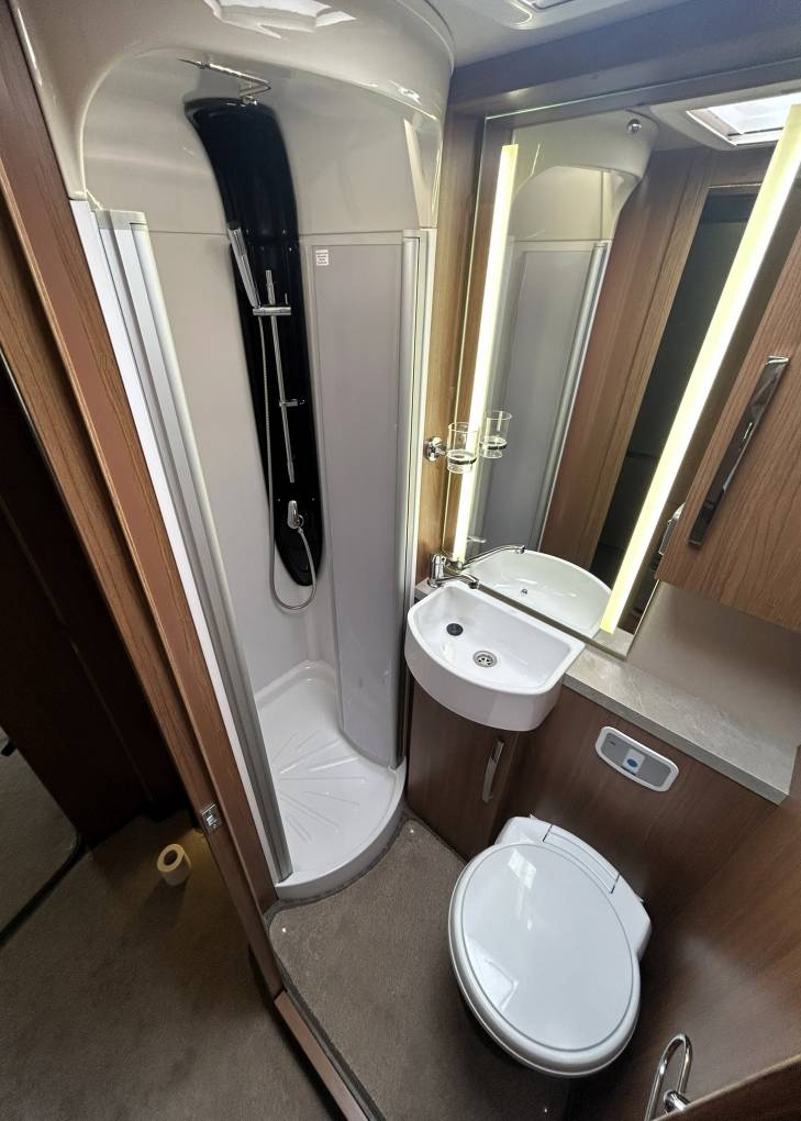 The washroom is located to the centre of the van and comprises of a shower cubicle, hand wash basin with vanity unit and a flushing cassette toilet.