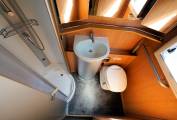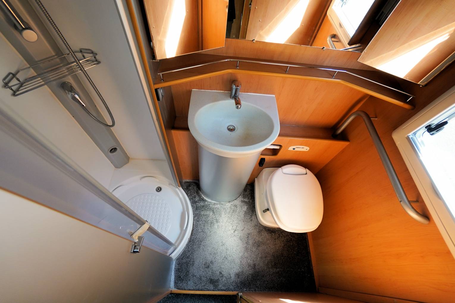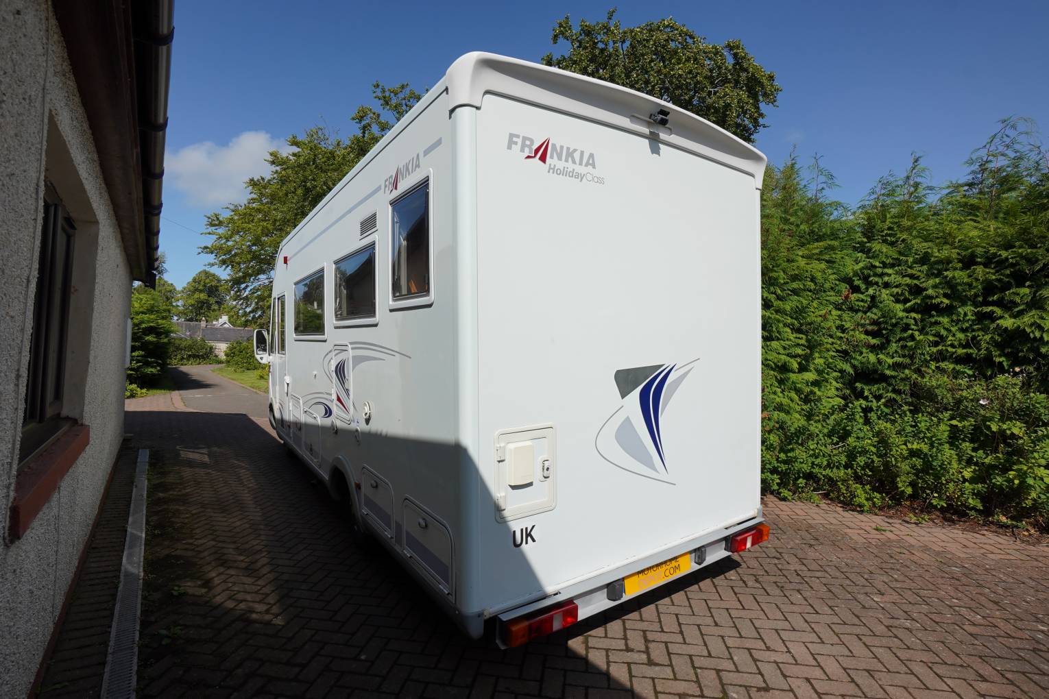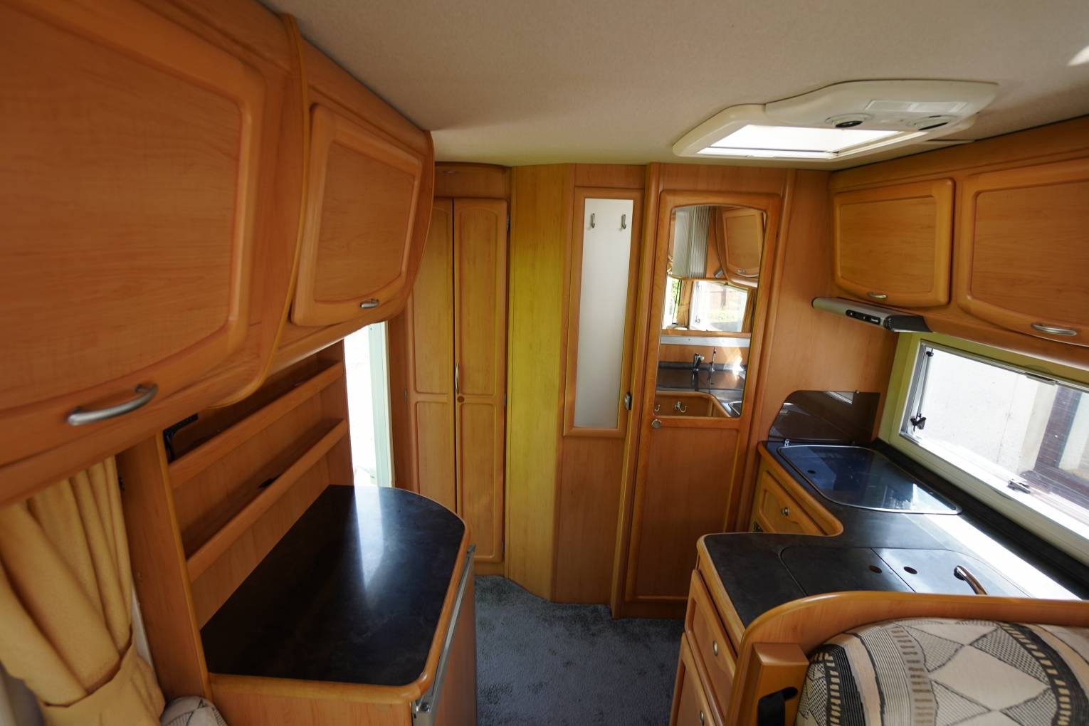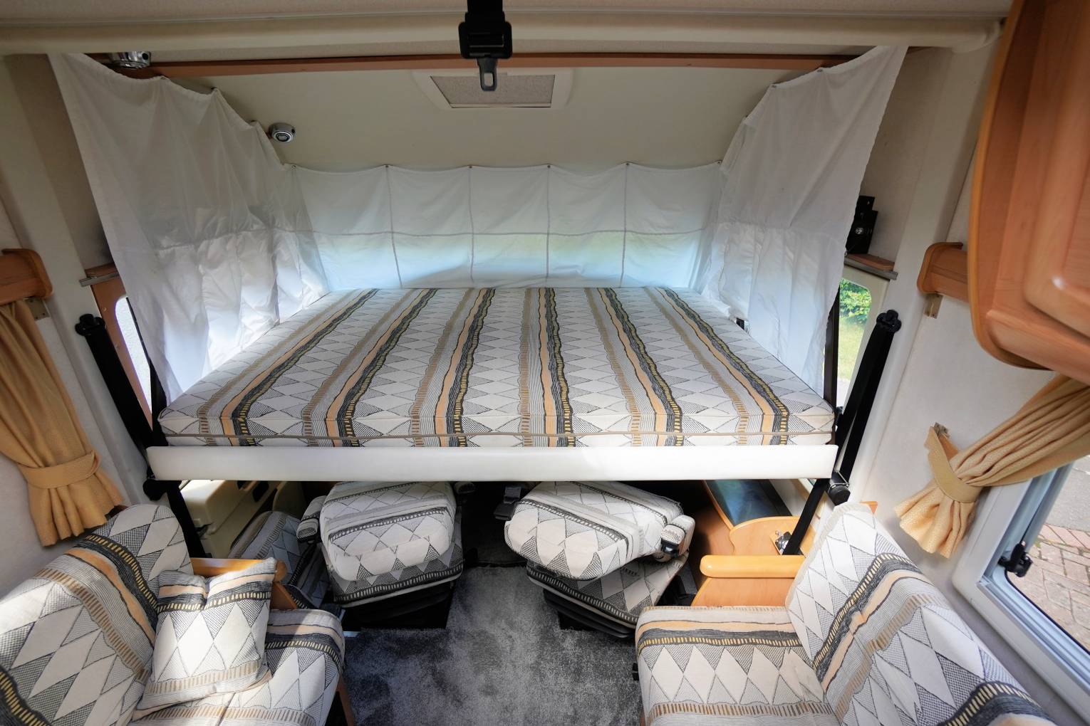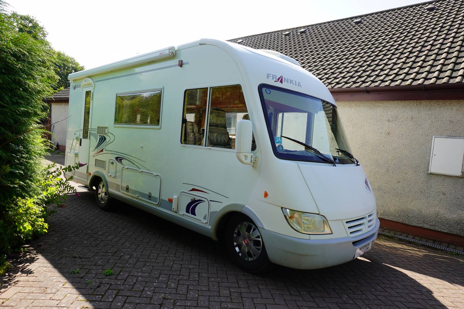 For sale we have a 2003 Frankia i650 Holiday Class, 4-berth, 4-seatbelts, over-cab drop-down bed, end-washroom, A-class motorhome.