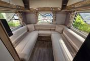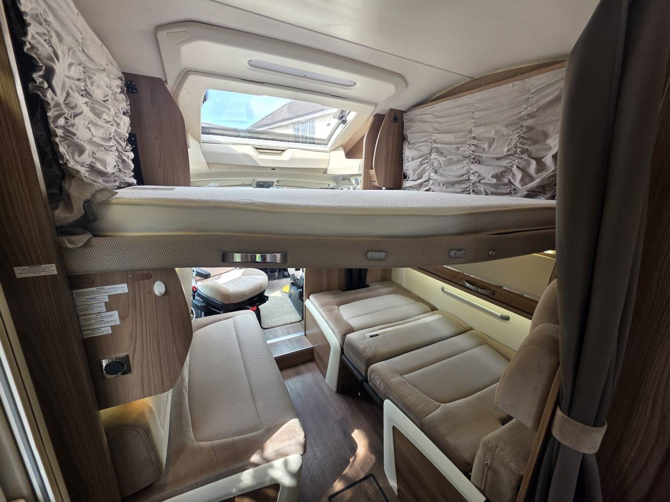 The layout is a rear U shape lounge, washroom and opposite the galley kitchen, then small sofa opposite a 4 seat dinette, with manual drop down bed above and 2 seats upfront, with sunroof above.