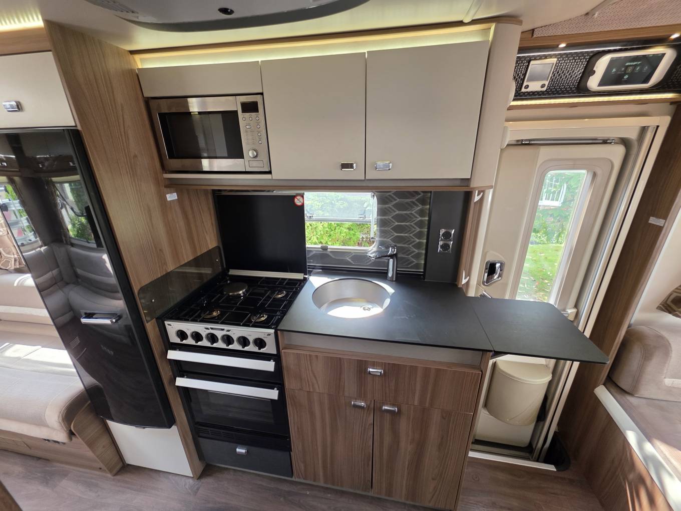 In the kitchen, there is a cooker with oven, grill, 3 gas burners and electric hob, a sink, tall fridge freezer, with plenty of storage surrounding, plus microwave and useful pop up worktop next to the habitation door.