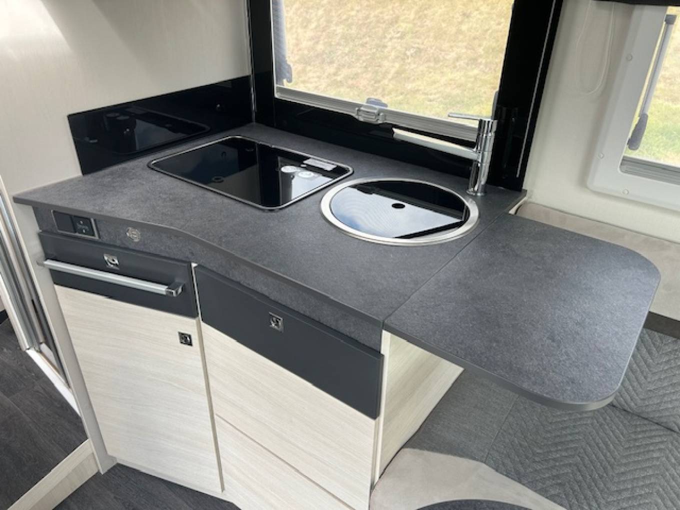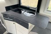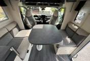 The lounge consists of twin swivel cab seats, a sliding central dining table with telescopic leg and two couches facing one another. The couches can be converted into two forward facing travelling seats. There is also a TV fitted in the habitation area.
