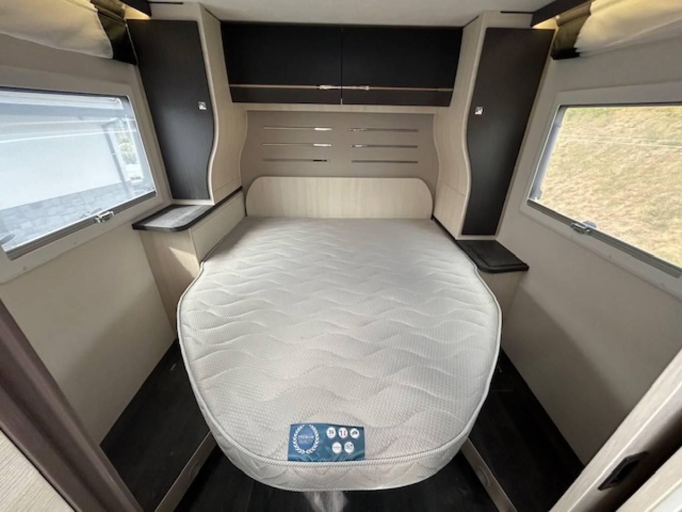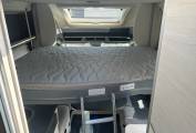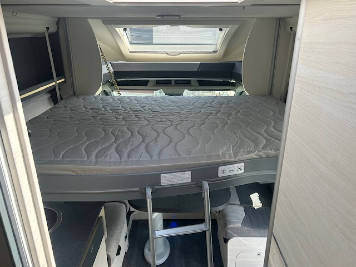 The large island bed is located at the rear of the vehicle which can be lifted to allow access to the garage. The electric drop down bed is located over the lounge.