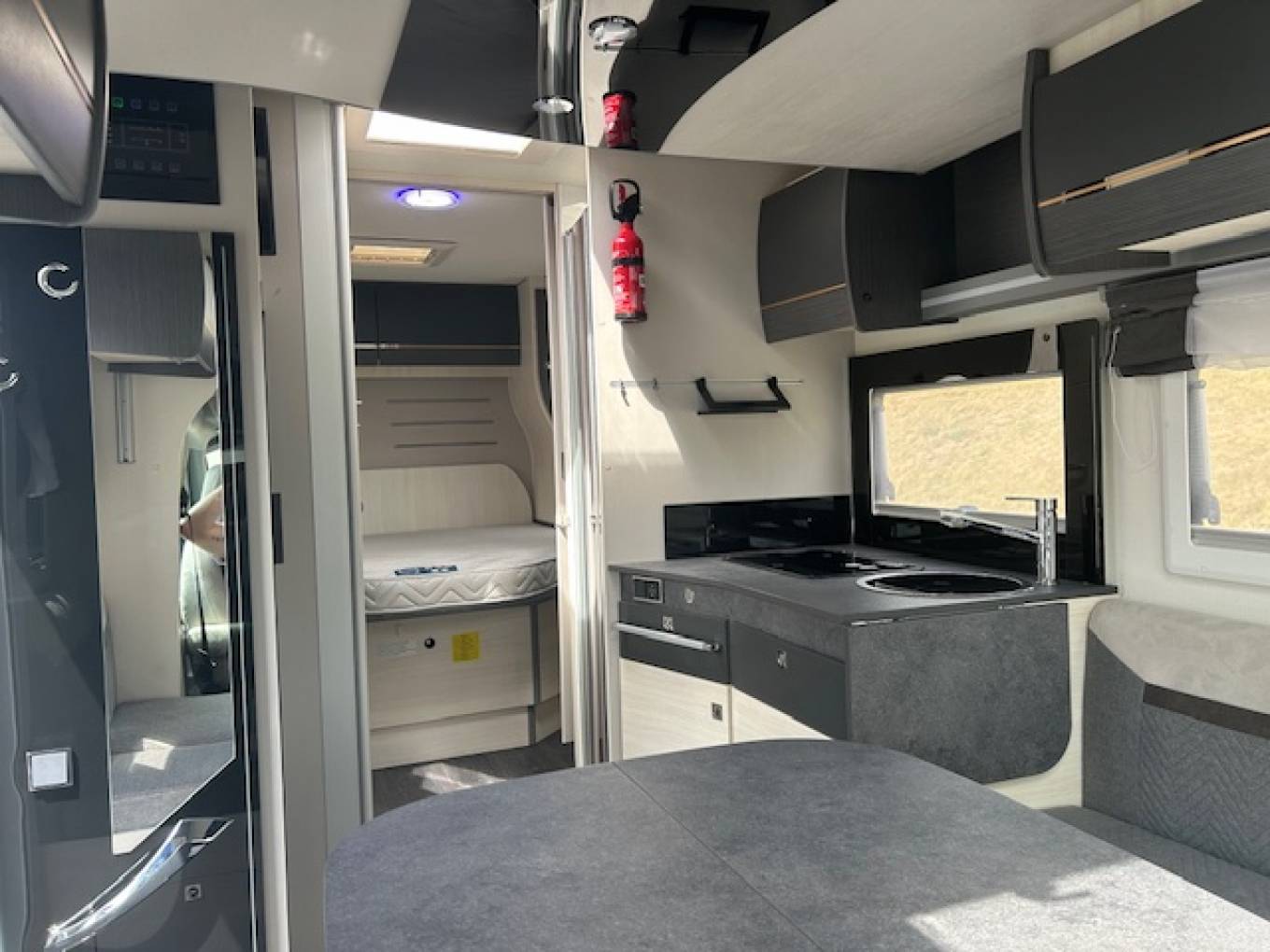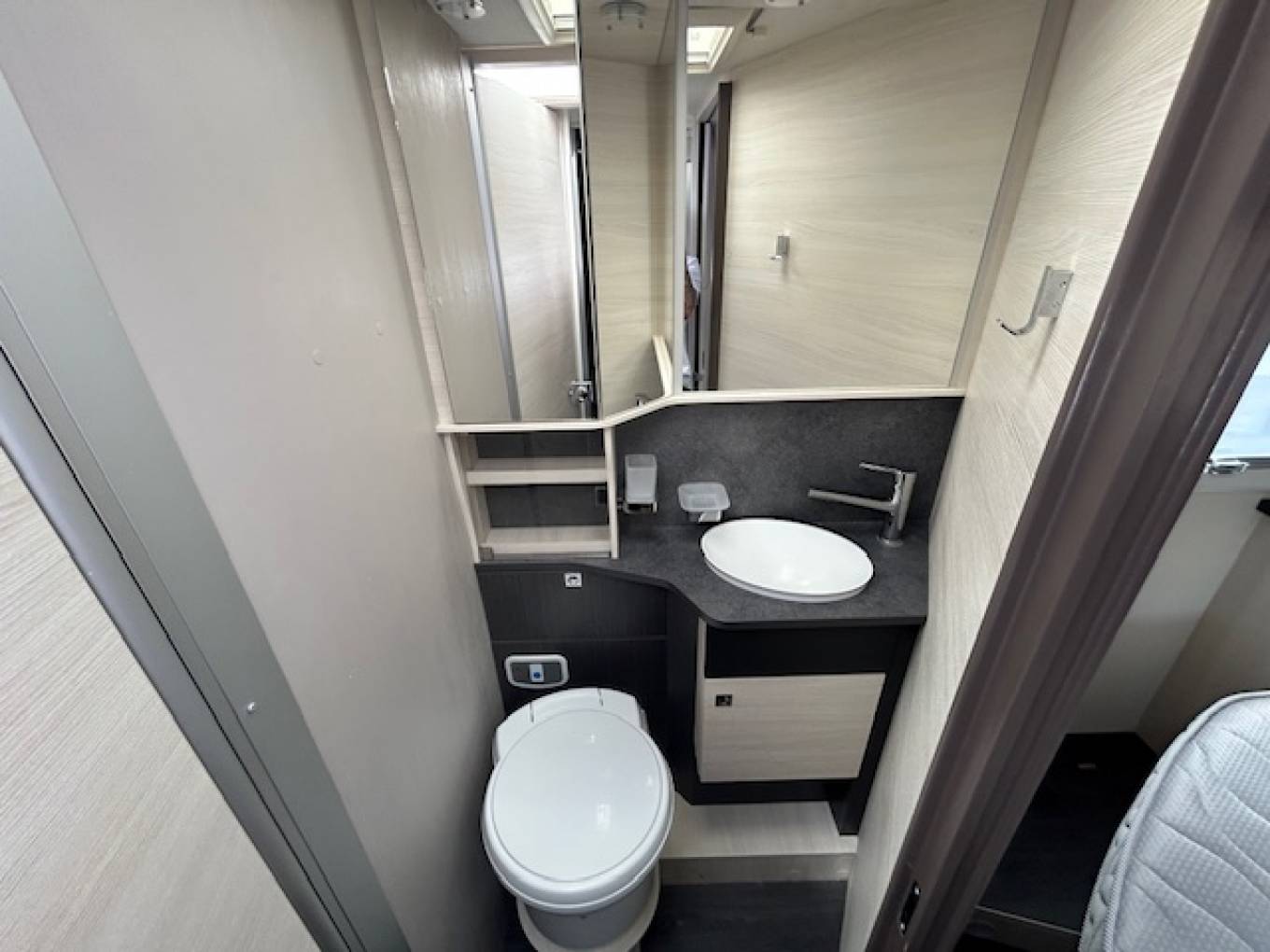 Towards the rear of the motorhome there is a separate shower room and a toilet/washroom on opposite sides.