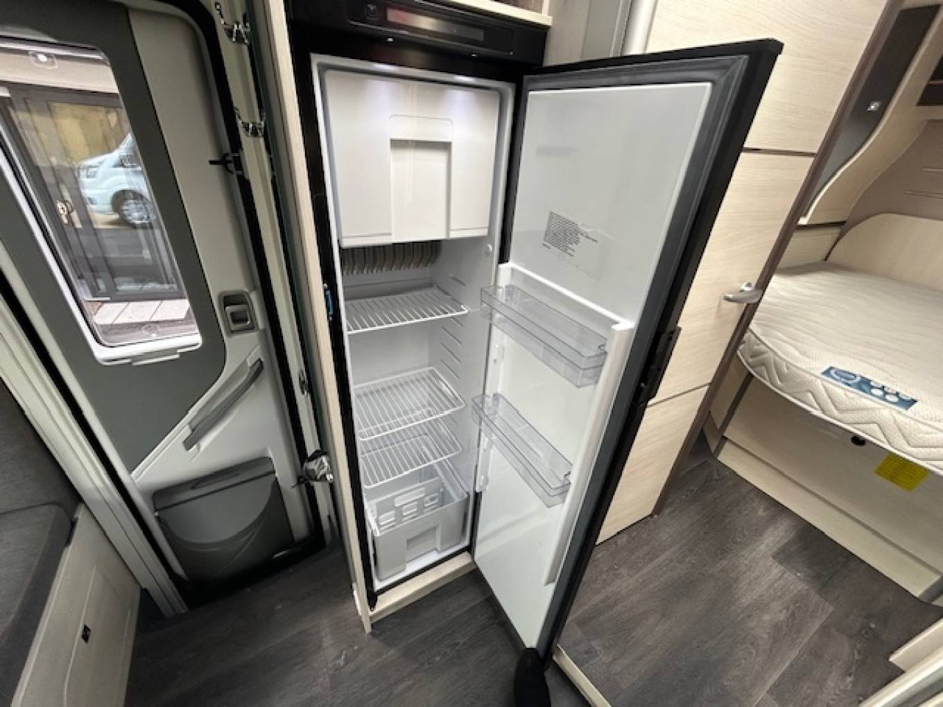 The kitchen consists of a dual hob with hinged glass cover, a sink, a spacious three way fridge/freezer and plenty of storage space.