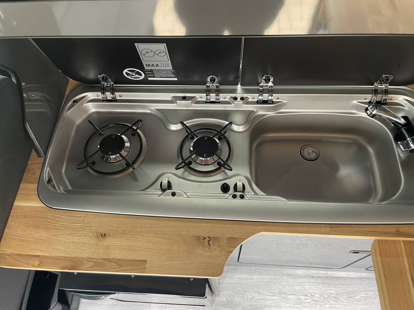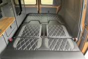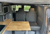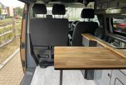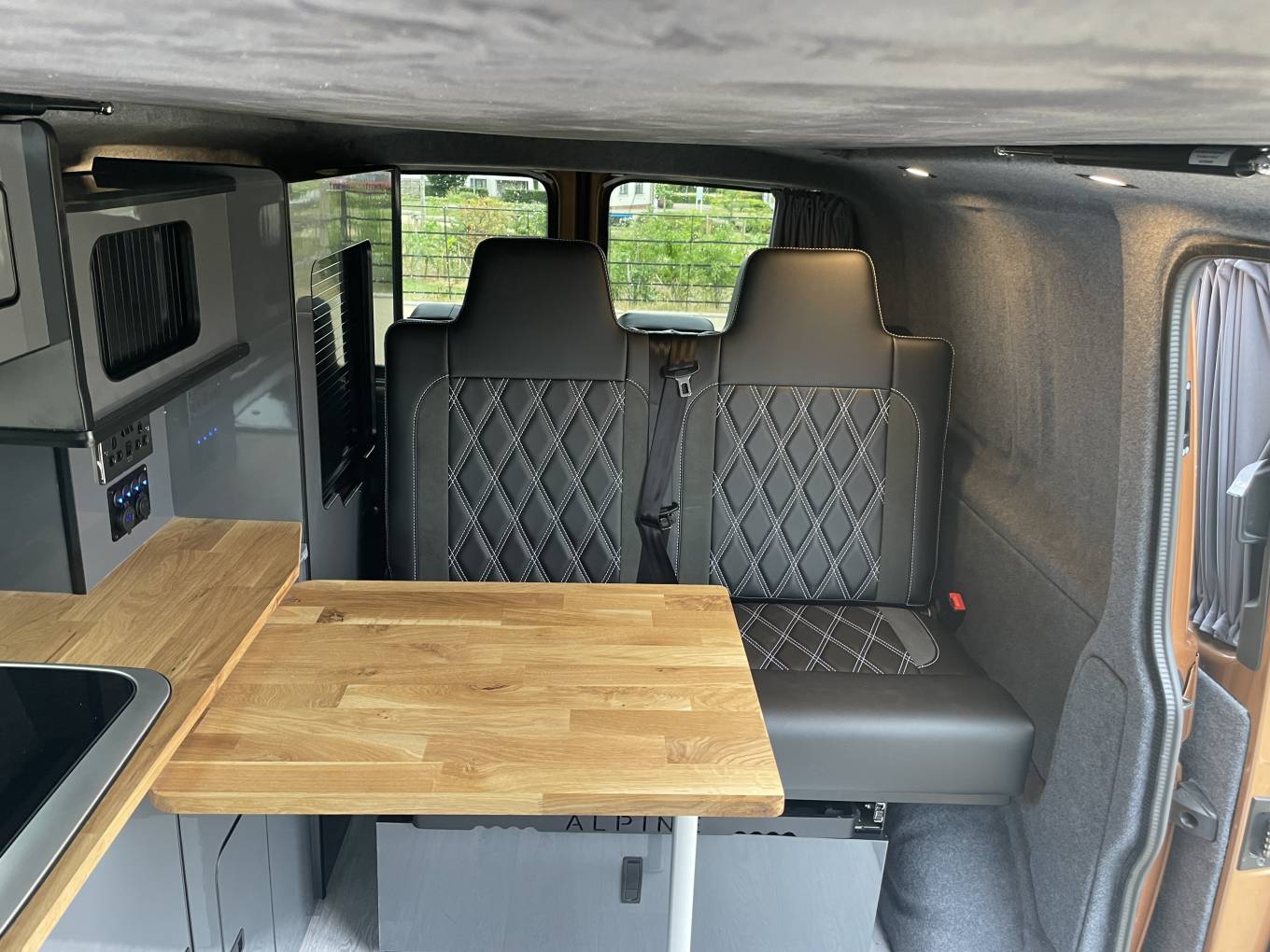 Fully fitted by Alpine Campers, this short wheelbase camper boasts thoughtful craftsmanship and practicality. It features the acclaimed 'Dynamic Poptop' with warranty coverage, an 'Easy Spinner' front captain’s seat, and the Alpine Rock & Roll bed with integrated under-bed storage. The kitchenette is a camper’s dream, sporting a classy oak work surface with a hob, sink, and a fridge freezer tucked neatly underneath.