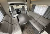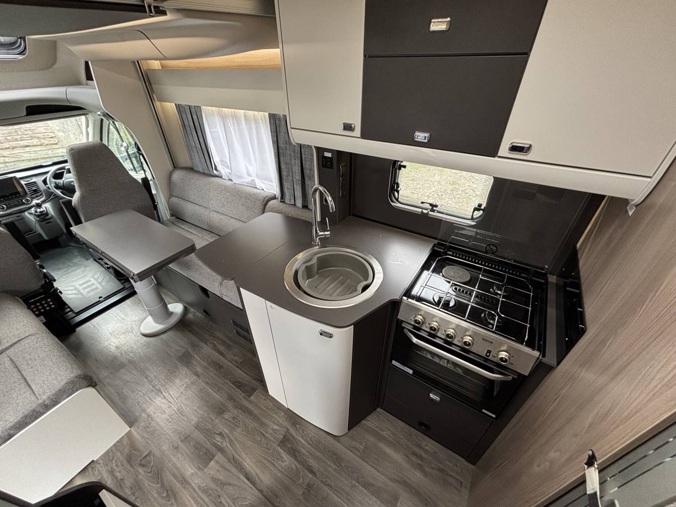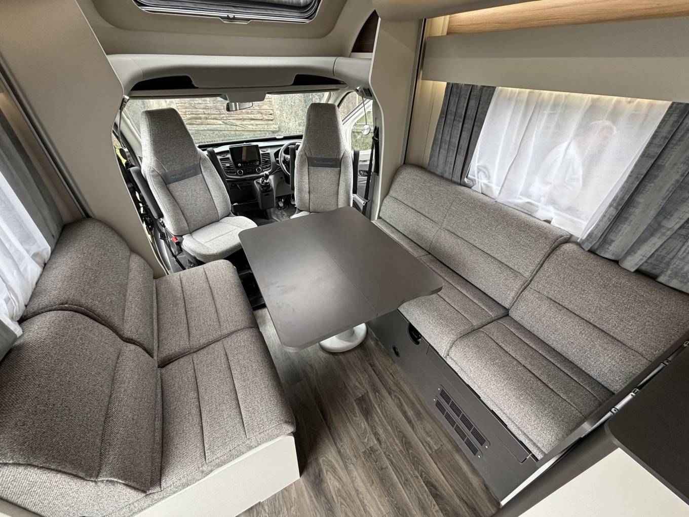 Layout - Central lounge/dinette with 2 forward facing fold-away seats w/seat belts under the 2 side facing sofas, plus an adjustable electric dining table. Electrically operated drop down double bed over the dinette. The kitchen has a fitted gas cooker (1 elec & 3 gas hobs) & oven/grill, fridge/freezer which opens from both sides, sink, cutlery drawer & cabinets. End washroom with a shower cubicle, sink, wc, cabinets & mirror, large wardrobe, the garage you can access from both sides of the vehicle which is always a nice touch.