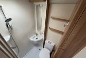 The fully-equipped kitchen includes a 4-burner gas hob, oven, grill, microwave, fridge with freezer, and ample storage. Opposite, the washroom features a separate shower cubicle, cassette toilet, and hand basin, making off-grid camping easy.