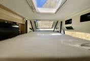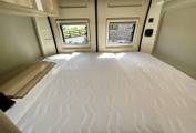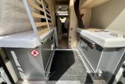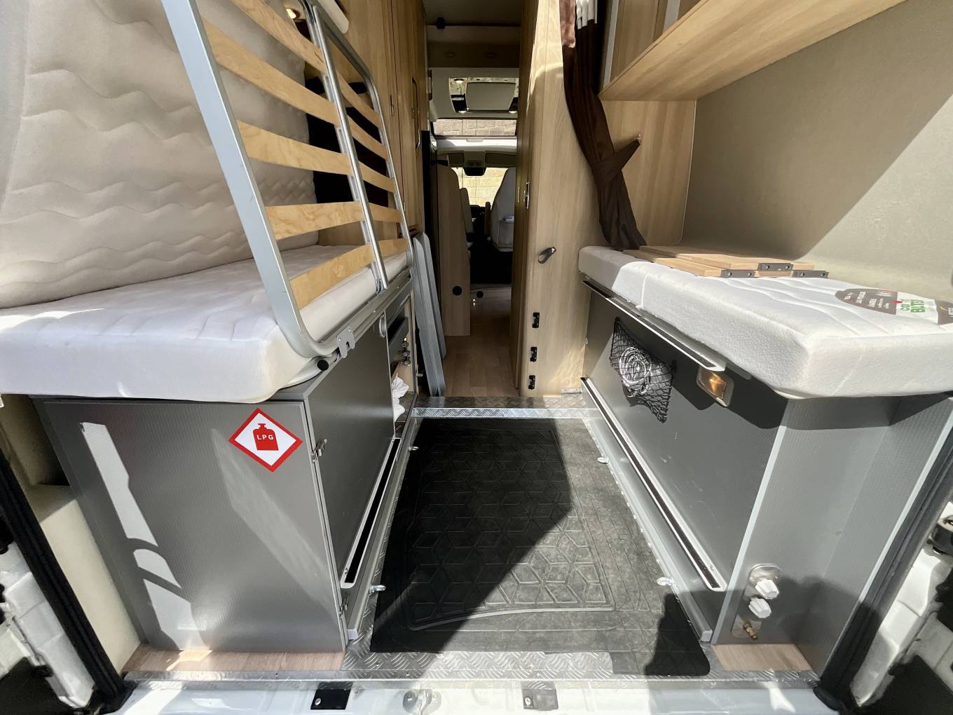 At the back, there is plenty of overhead lockers, but also a large garage space with tether points so that you can travel with a bike in the back. At night, the double bed can be made up quickly.