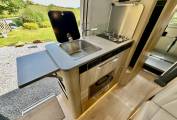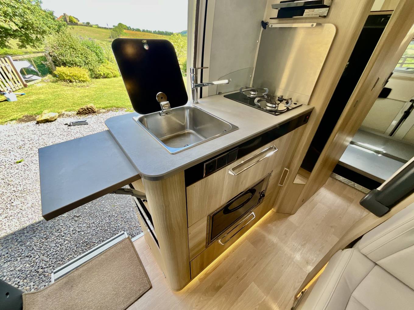 The kitchen is equipped with two gas hobs, sink, fold out prep space, Dometic oven/grill, Dometic fridge/freezer and plenty of storage. It used electronic locking to ensure that everything is secure in cupboards during travel.