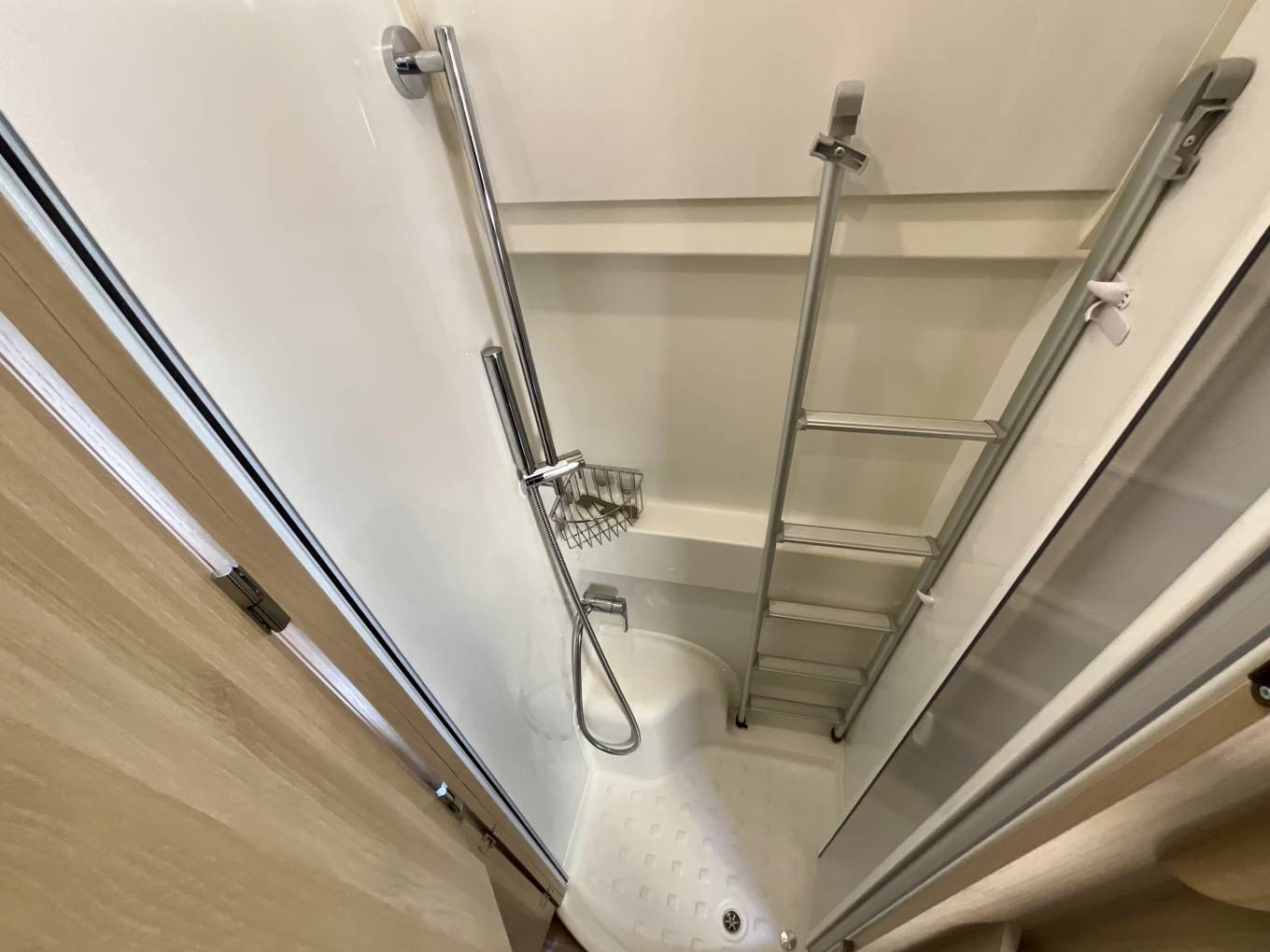 The mid washroom features a clever design patented by Rapido, the MODULSPACE wardrobe system. To allow a large wardrobe and a separate shower, the wardrobe is on hinges and swings out of the shower area, allowing plenty of room. Opposite, the toilet room with Thetford toilet with cassette, vanity unit and washbasin feature.