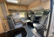 The basic layout is fixed double bed above garage, mid-section washroom, then dinette with 2 seatbelts, kitchen and 2 captains’ seats upfront. All upholstery is 2 tone leather.