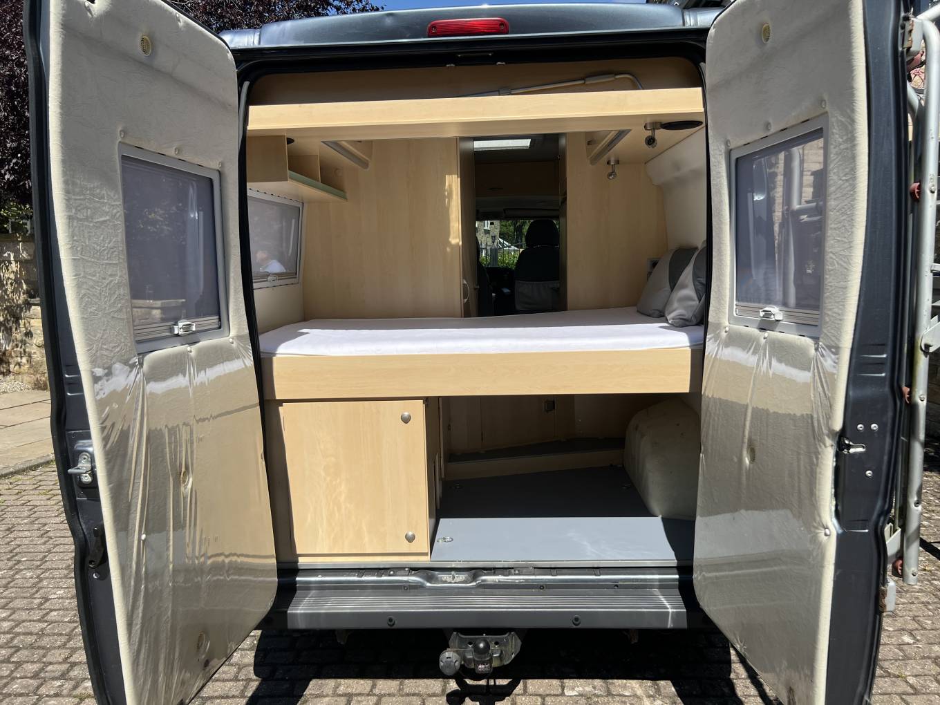 At the rear, is a large transverse double bed plus storage above and garage space, with anchor points below.