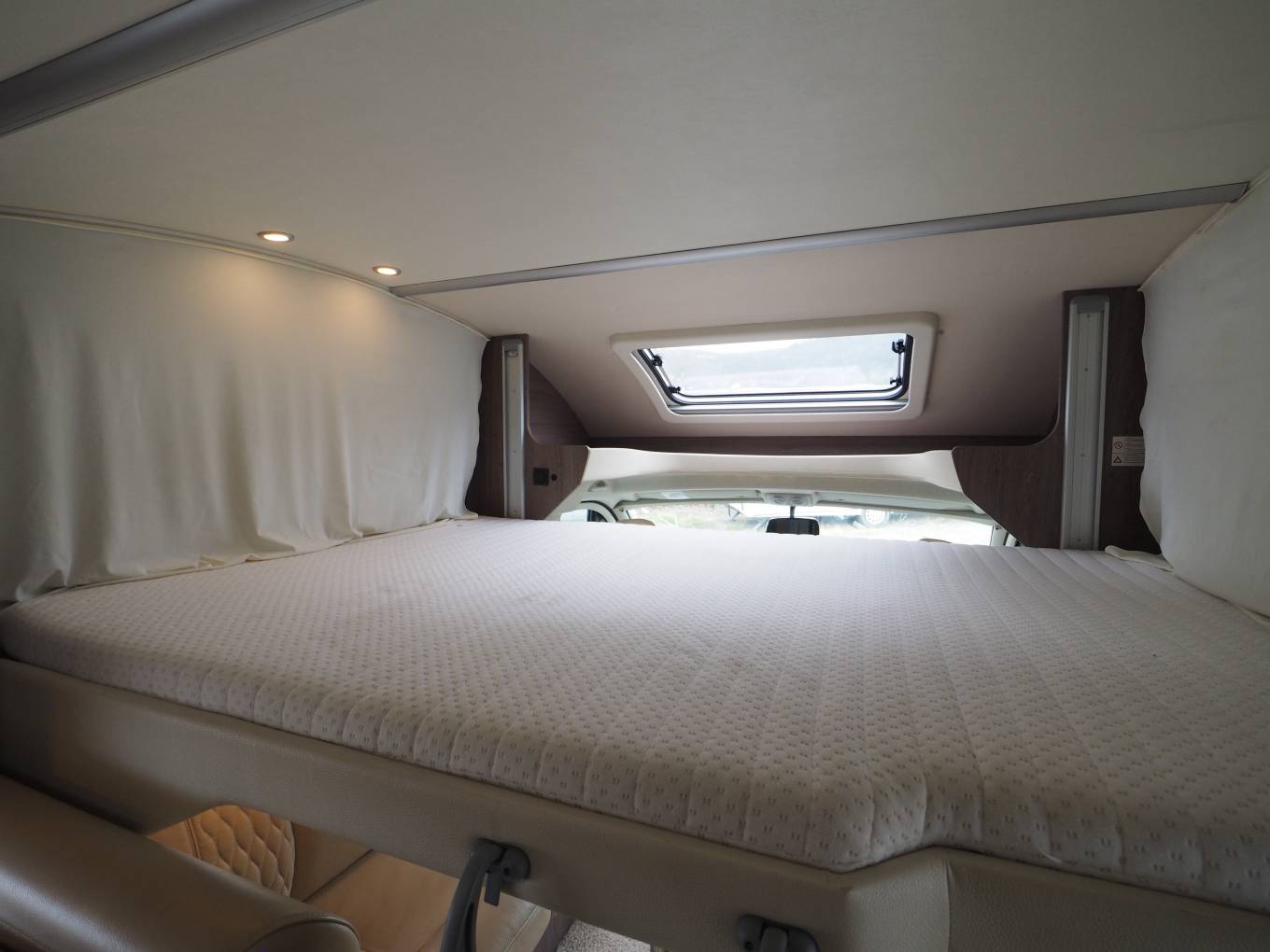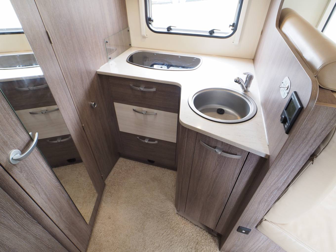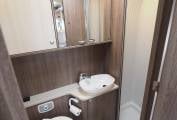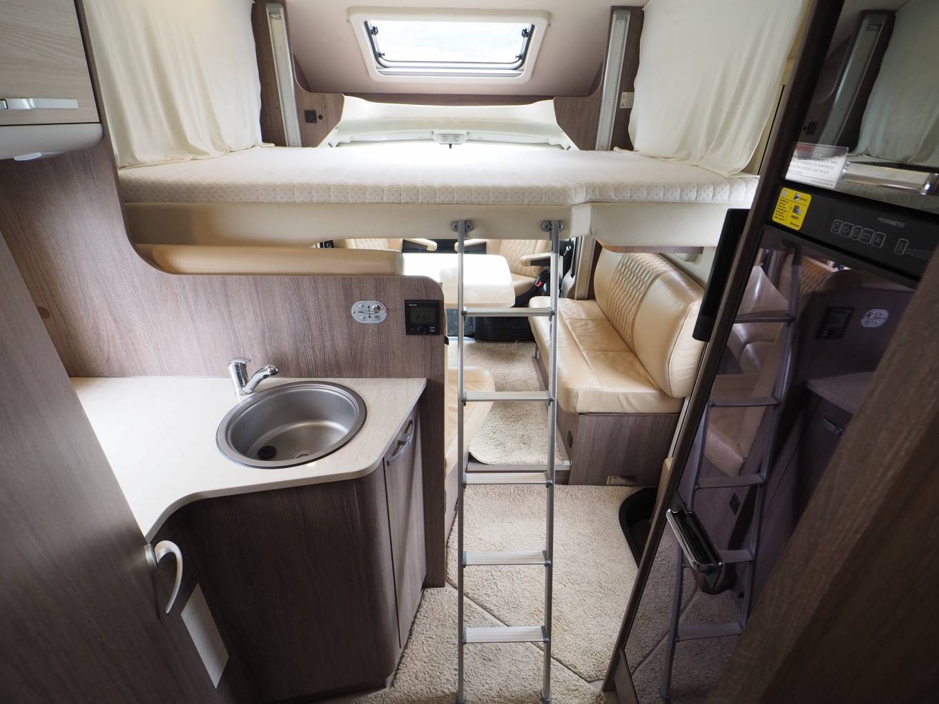 Accomodation includes a large open and comfortable lounge area with removable table where you can relax, dine and entertain. The side sofa can be used as a third berth. Soft leather finish to all the seating and both driver and passenger seats swivel into the lounge to creat space for 6 or 7 adults. Storage lockers above and a TV point with Avtex TV fitted. An electronic drop-down double bed provides the main sleeping area. The kitchen comes with a 3 burner gas hob, sink with mixer tap, combi oven/grill and a large fridge freezer. To the rear is a spacious washroom with flushing cassette toilet, sink with vanity mirror and storage, separate shower cubilcle and wardrobe and drawer storage.
