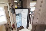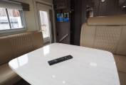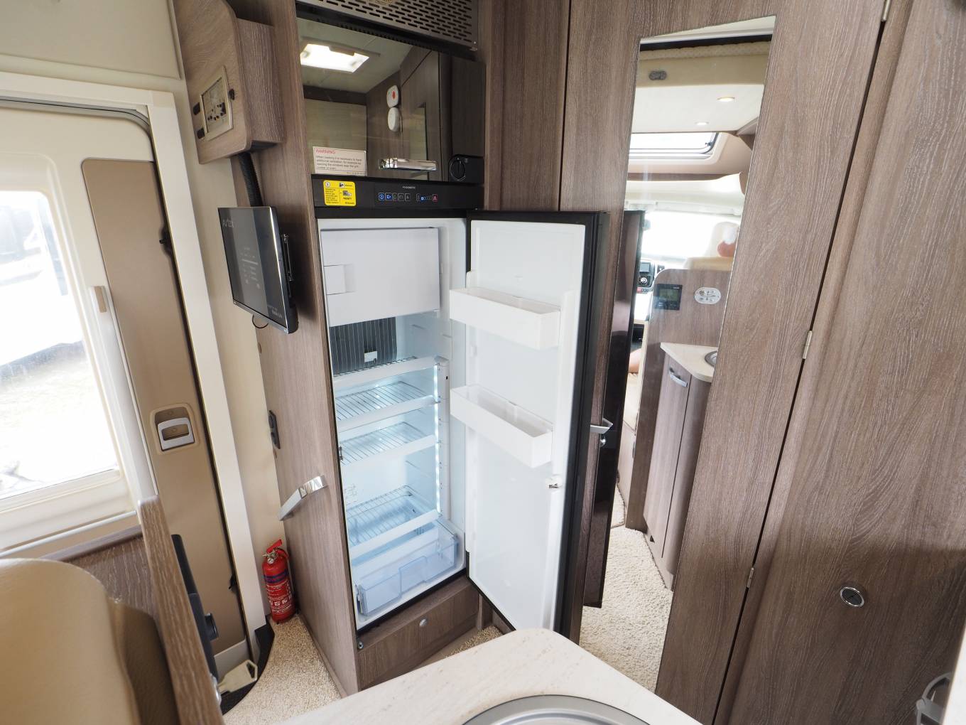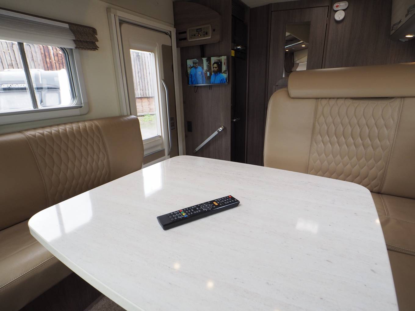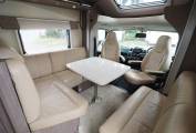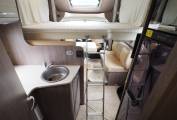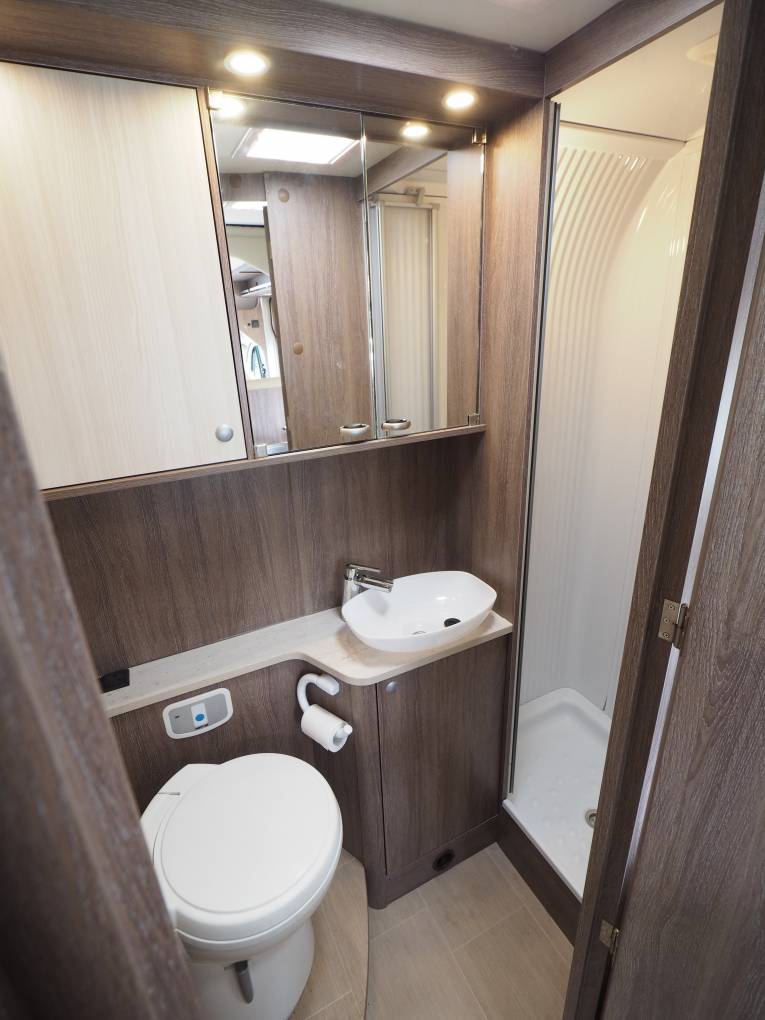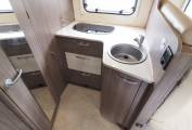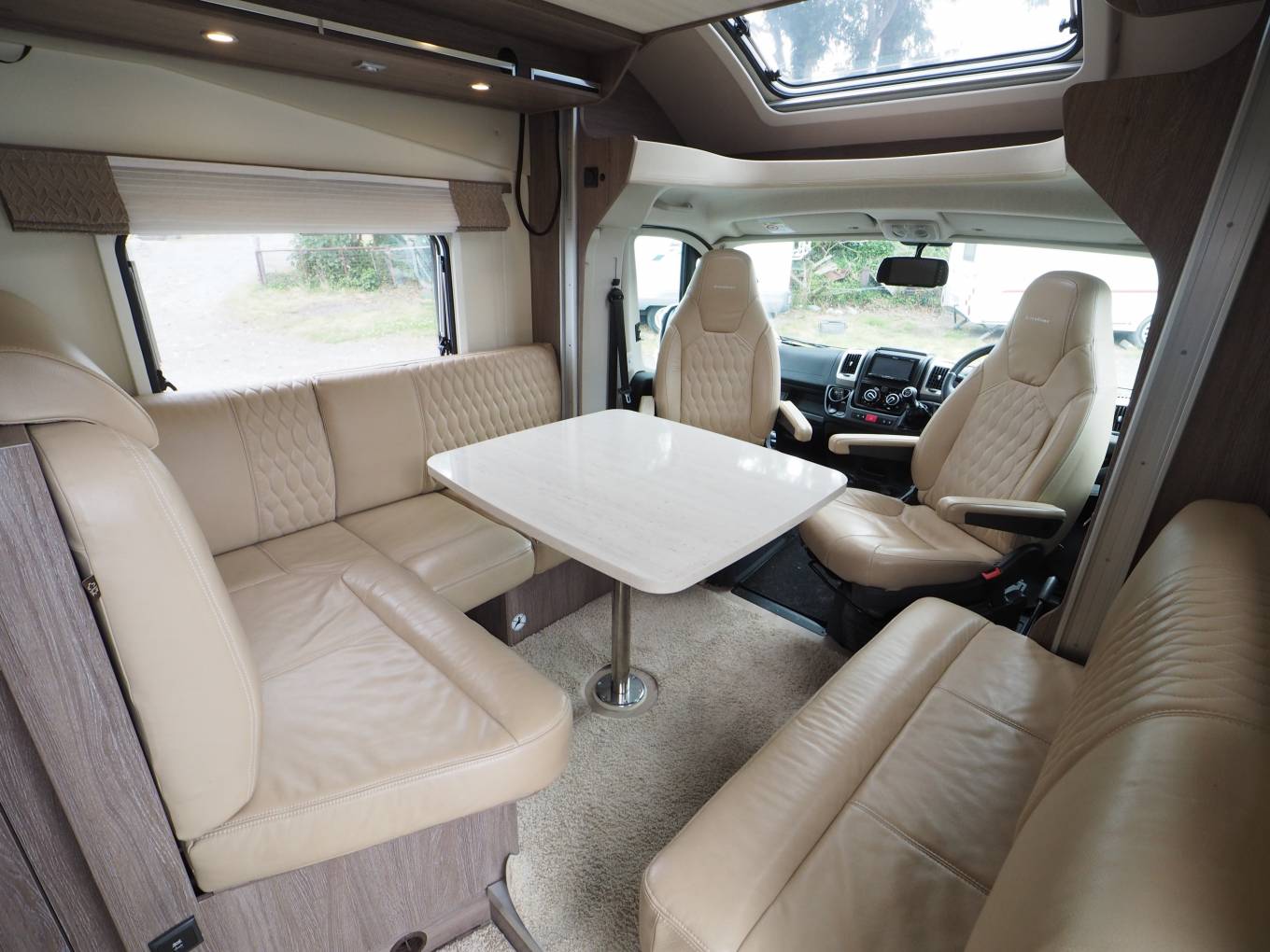 Accomodation includes a large open and comfortable lounge area with removable table where you can relax, dine and entertain. The side sofa can be used as a third berth. Soft leather finish to all the seating and both driver and passenger seats swivel into the lounge to creat space for 6 or 7 adults. Storage lockers above and a TV point with Avtex TV fitted. An electronic drop-down double bed provides the main sleeping area. The kitchen comes with a 3 burner gas hob, sink with mixer tap, combi oven/grill and a large fridge freezer. To the rear is a spacious washroom with flushing cassette toilet, sink with vanity mirror and storage, separate shower cubilcle and wardrobe and drawer storage.