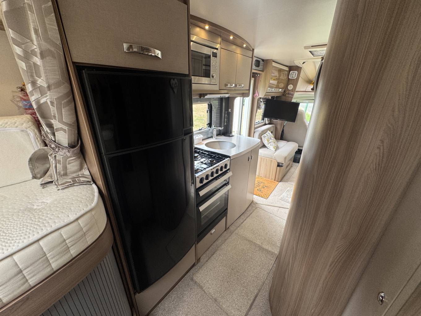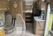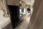 Carrying on through, you come to the kitchen which has everything you need to rustle up a lovely meal. There is a 3 gas, 1 electric ring burner hob, a oven with grill, a tall Dometic 3 way fridge with separate freezer compartment, a sink with mixer tap, a microwave and lots of storage space for utensils and ingredients plus a good work top area.