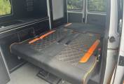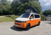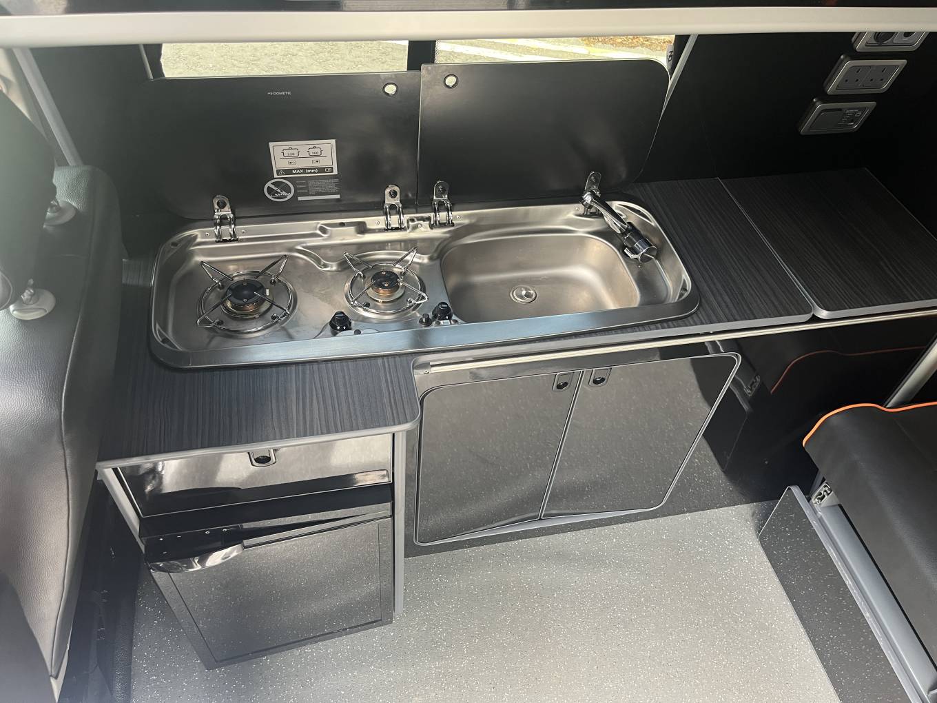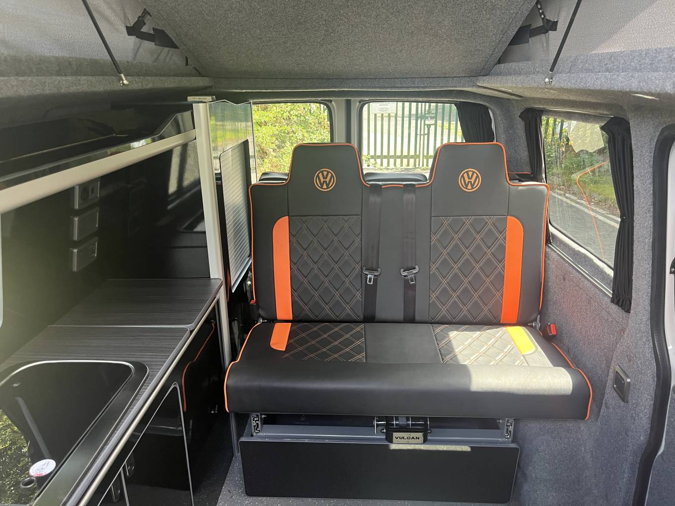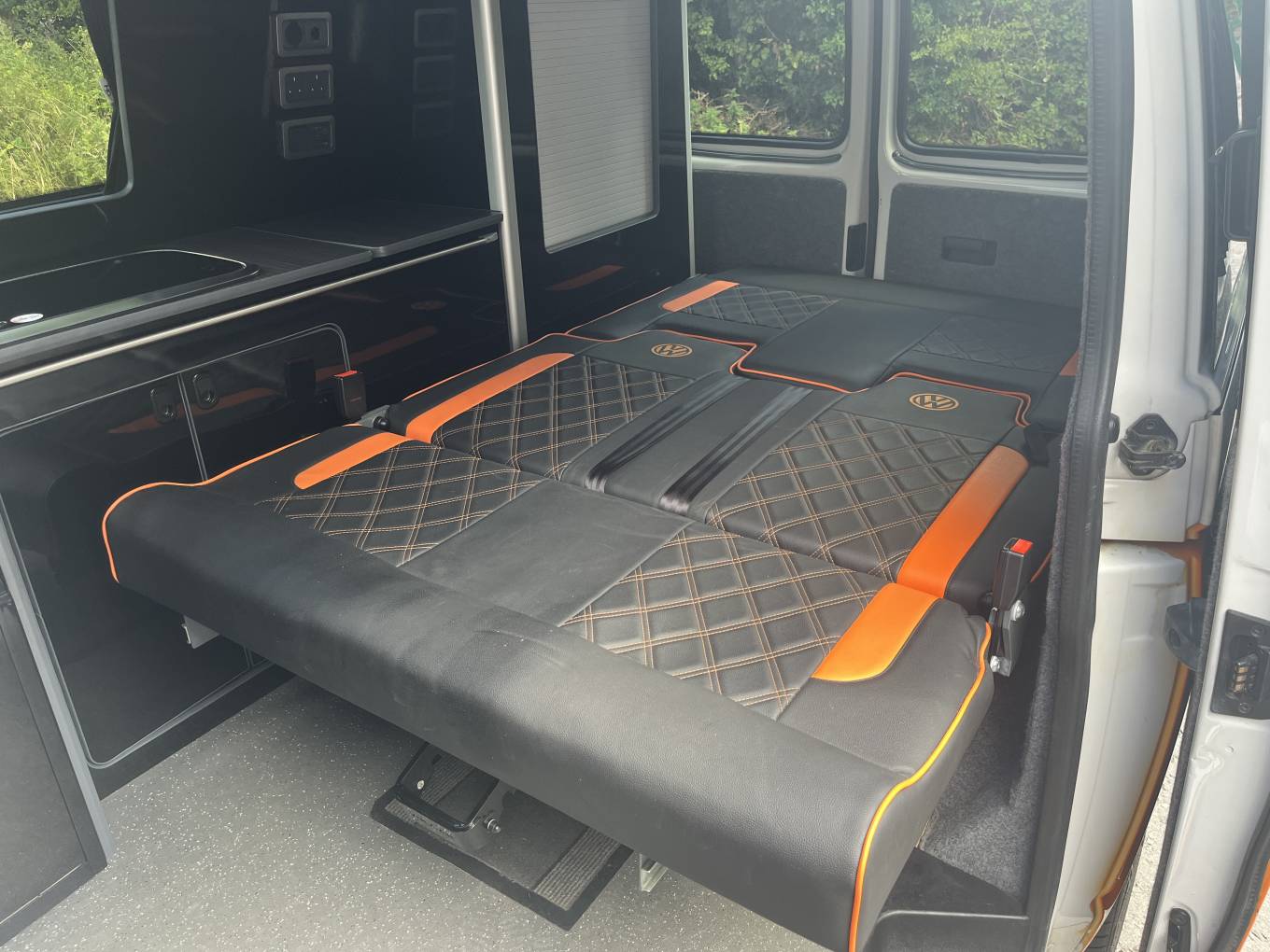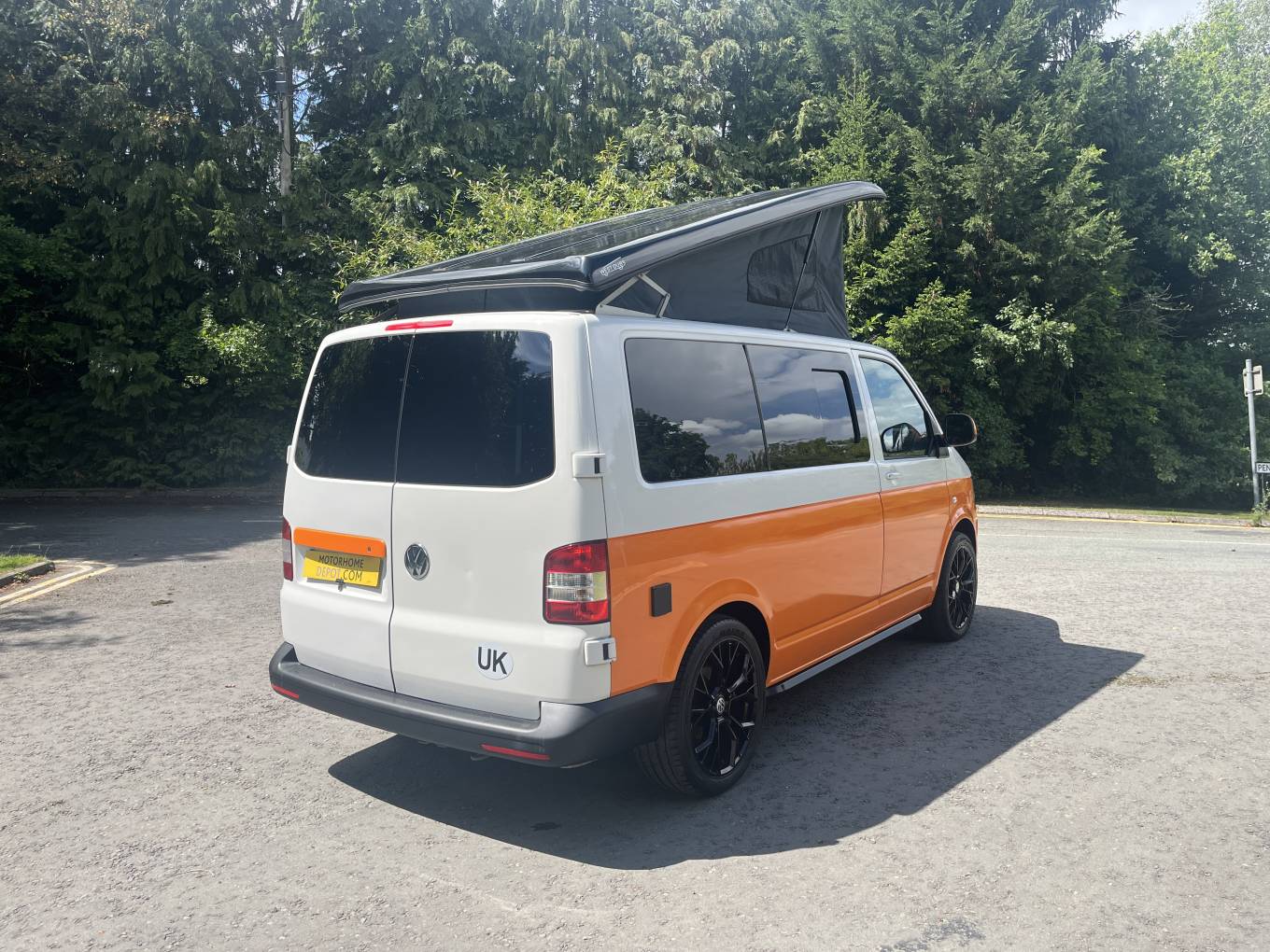 Here we have a 2014 Volkswagen T5 T28 2.0 Startline TDi, 3 Owners, Manual, lovely professional conversion, 5 Seats, 4 Berth, Pop Top, Rock & Rock Pull Out Bed, Kitchen - Fridge, Hob & Sink & Grill, Night Heater, Tailgate, 240v Electric Hook Up & 12v, Leisure Battery, 2 Front Seats with Captains Swivel Seats, 2 Rear Belted Seats, Storage Cupboards, On-board Water Tank, Radio.