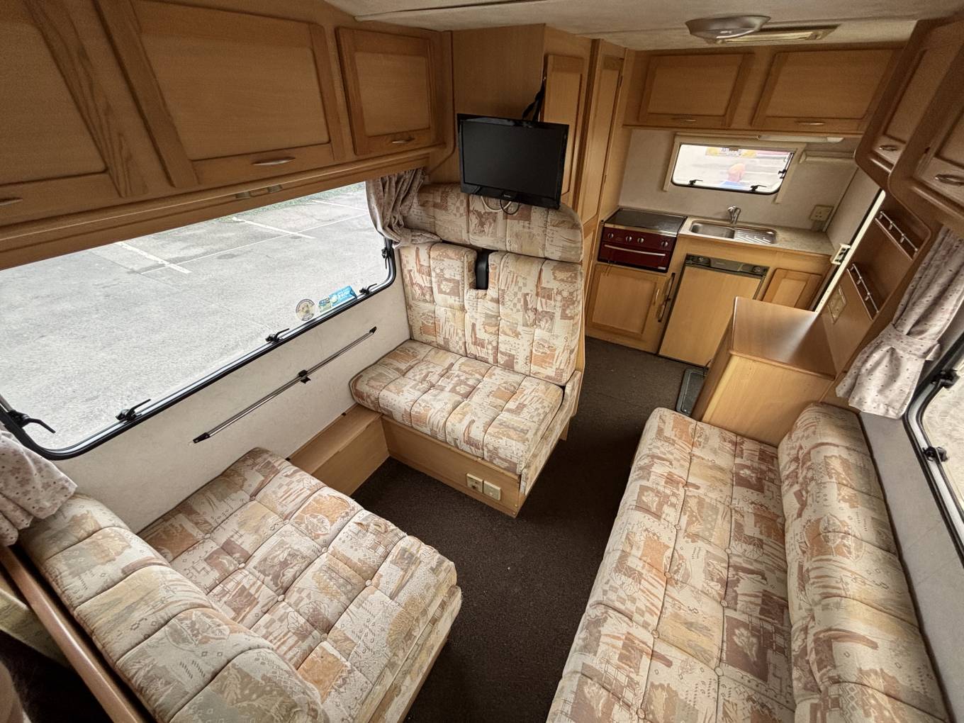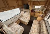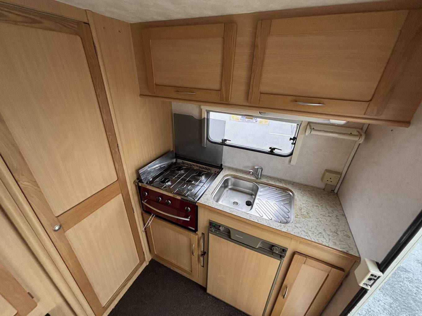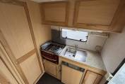 Layout - The Compass has a rear kitchen, with sink unit (hot and cold water) 3-way fridge with freezer compartment, 3 gas hobs and a gas grill. Adjacent to the kitchen is the washroom with chemical toilet, wash hand basin and overhead shower head with hot and cold water.