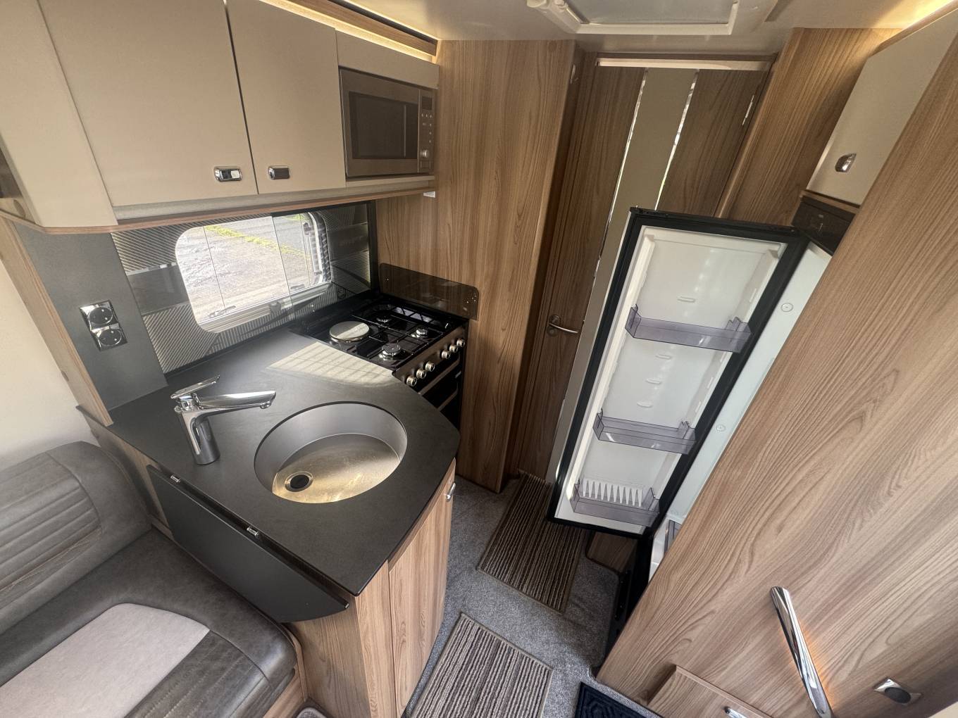 - Large full height Dometic fridge with freezer compartment where the door can be opened from both sides Stainless steel sink with mixer tap and lots of storage space for utensils and ingredients plus plenty of work top area, including an adjustable section nearest to lounge area