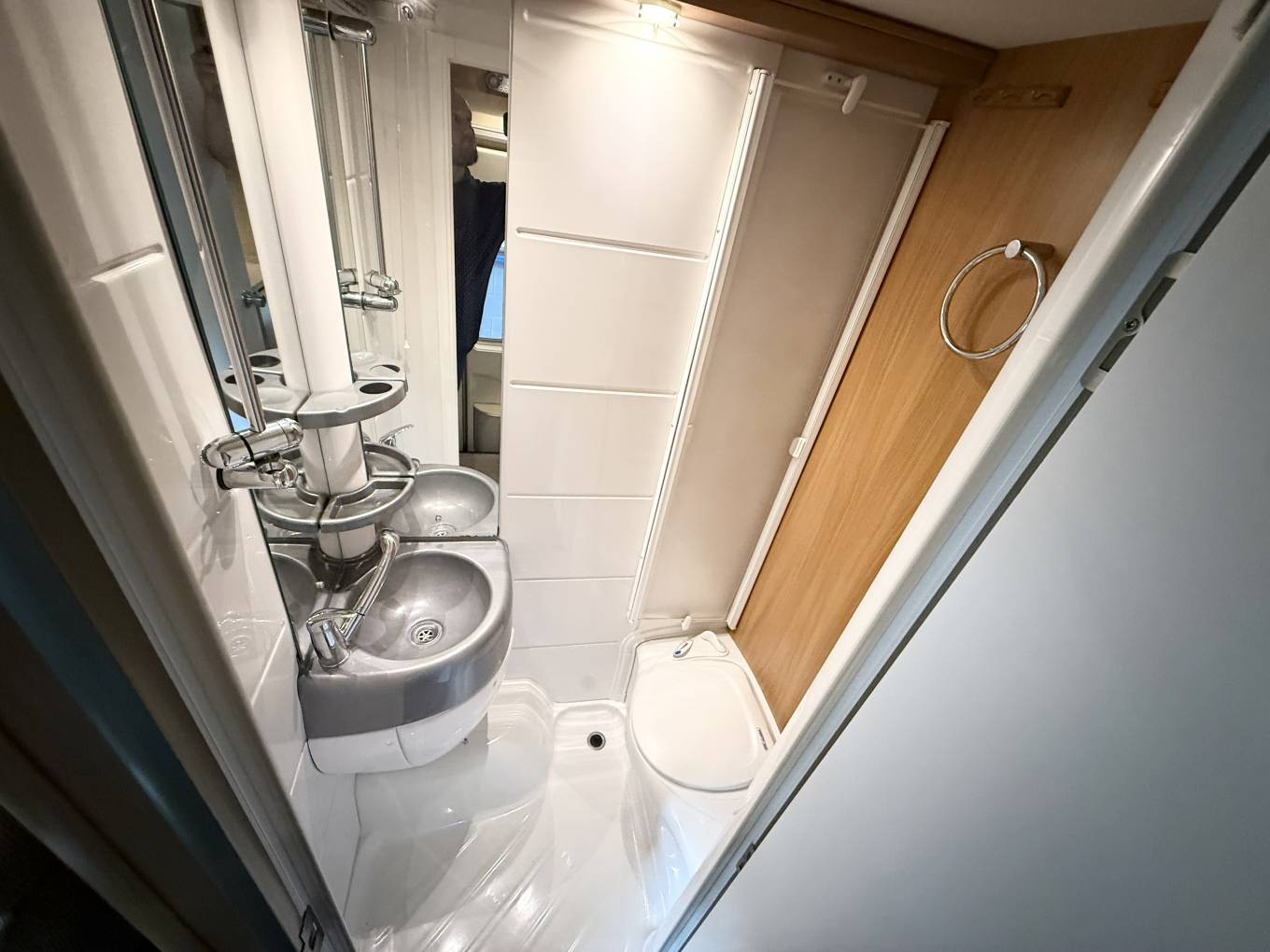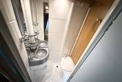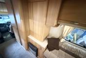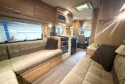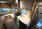 The rear lounge panoramic windows, as with all the habitation windows are complete with both fly screens and blinds for your convenience. There is a TV/DVD player in the lounge area and the Truma controls for the blown air heating. Above the centrally situated additional gas fire is a large wardrobe containing the free standing table, adjustable TV aerial and the solar controller. The central washroom comes with a swing wall shower, cassette toilet, wash basin, mirror and vanity unit. On the opposite side of the van is a well equipped kitchen that has a dual fuel hob (3 gas burners and 1 Electric hotplate), separate grill, oven and microwave, fridge, sink and worktop space.
