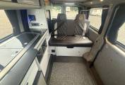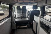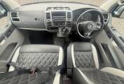 This model is externally and internally eye catching with the outside paintwork in metallic silver with chrome side foot bars and VW allows and inside it has its upholstery in SportsLine black and light grey striped VW leather with VW logo with worktops and cupboards in oak wood grey.