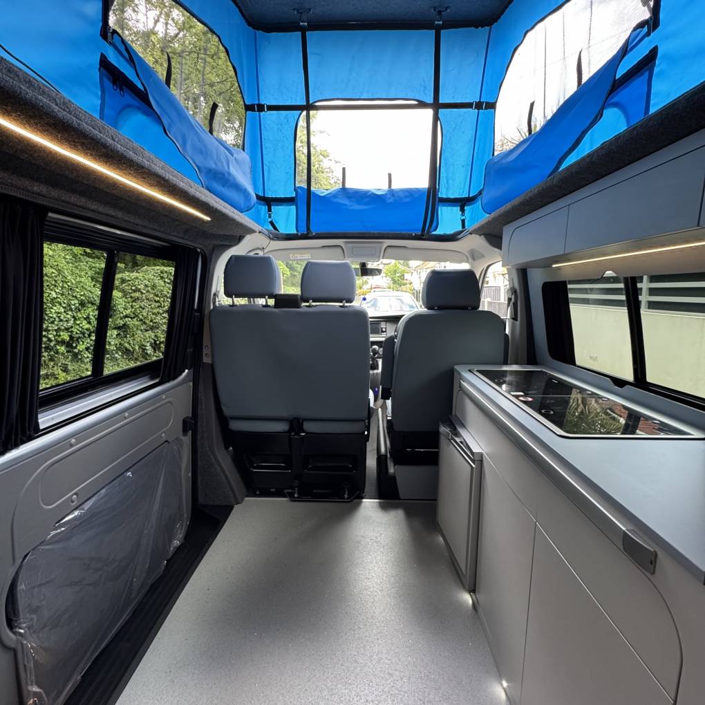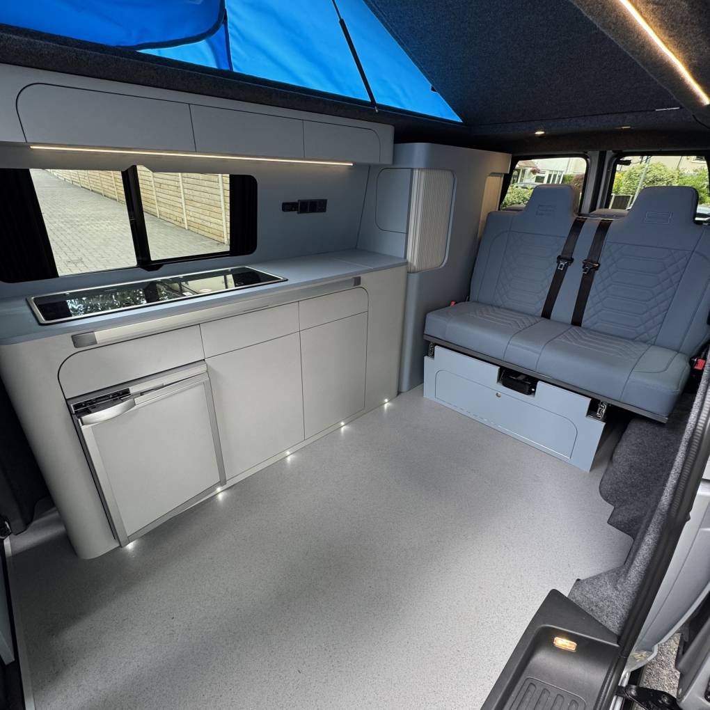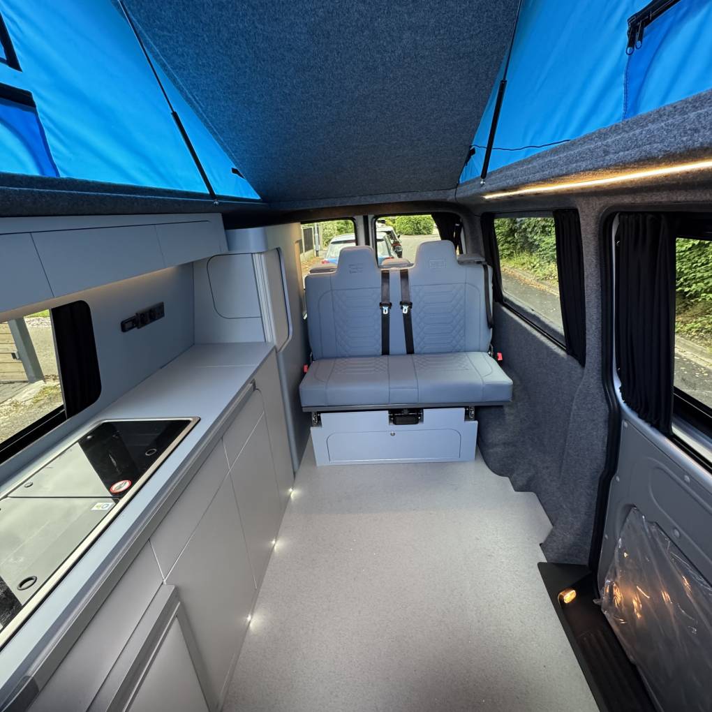 The luxury conversion has many impressive features and certainly stands out from the rest. Externally you have the pop top roof with blue material to give you that nice pop of colour and really compliments the main silver colour of the camper. The black alloy wheels and stunning front end will turn many heads. You also have the 160w solar panel mounted to the pop top to help with off grid capability.