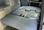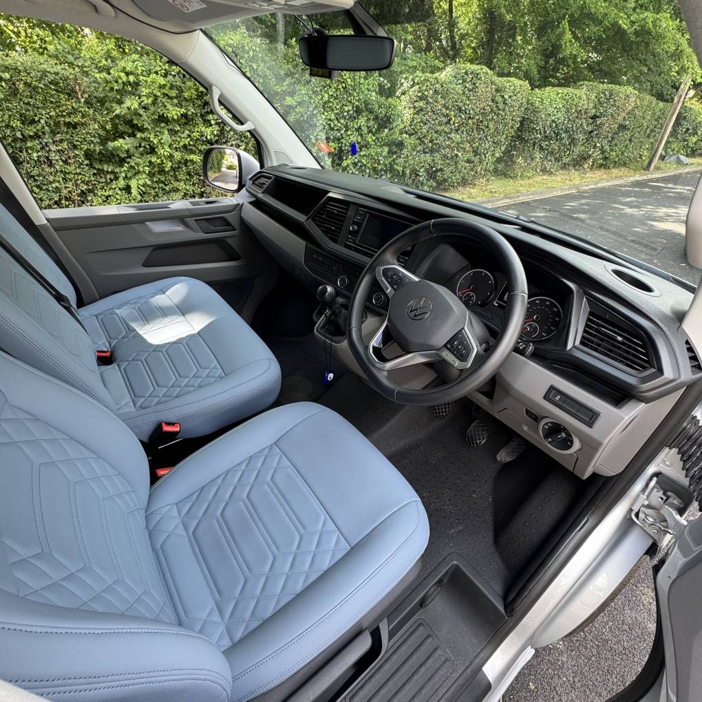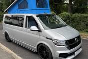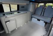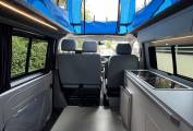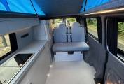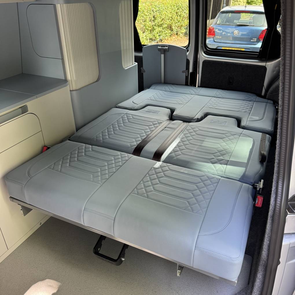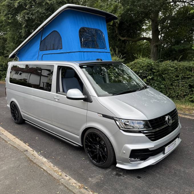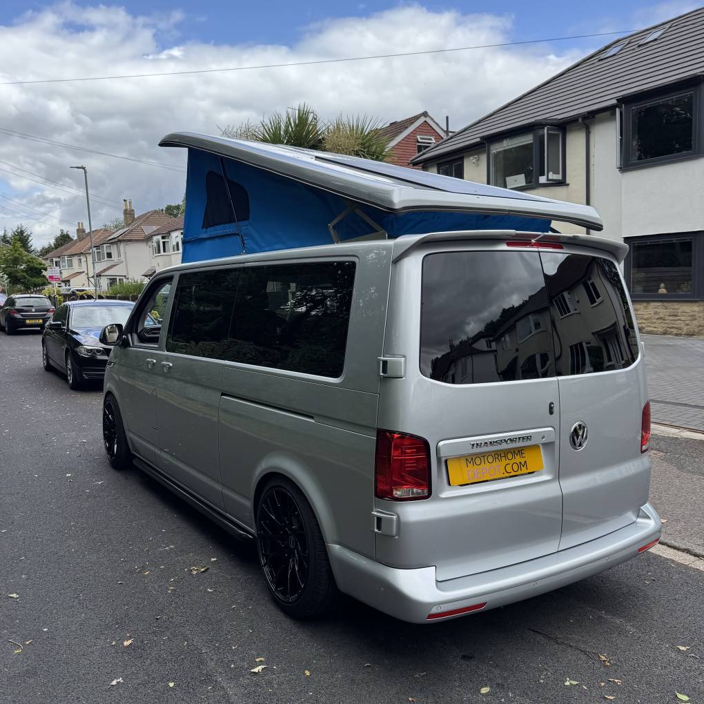The luxury conversion has many impressive features and certainly stands out from the rest. Externally you have the pop top roof with blue material to give you that nice pop of colour and really compliments the main silver colour of the camper. The black alloy wheels and stunning front end will turn many heads. You also have the 160w solar panel mounted to the pop top to help with off grid capability.