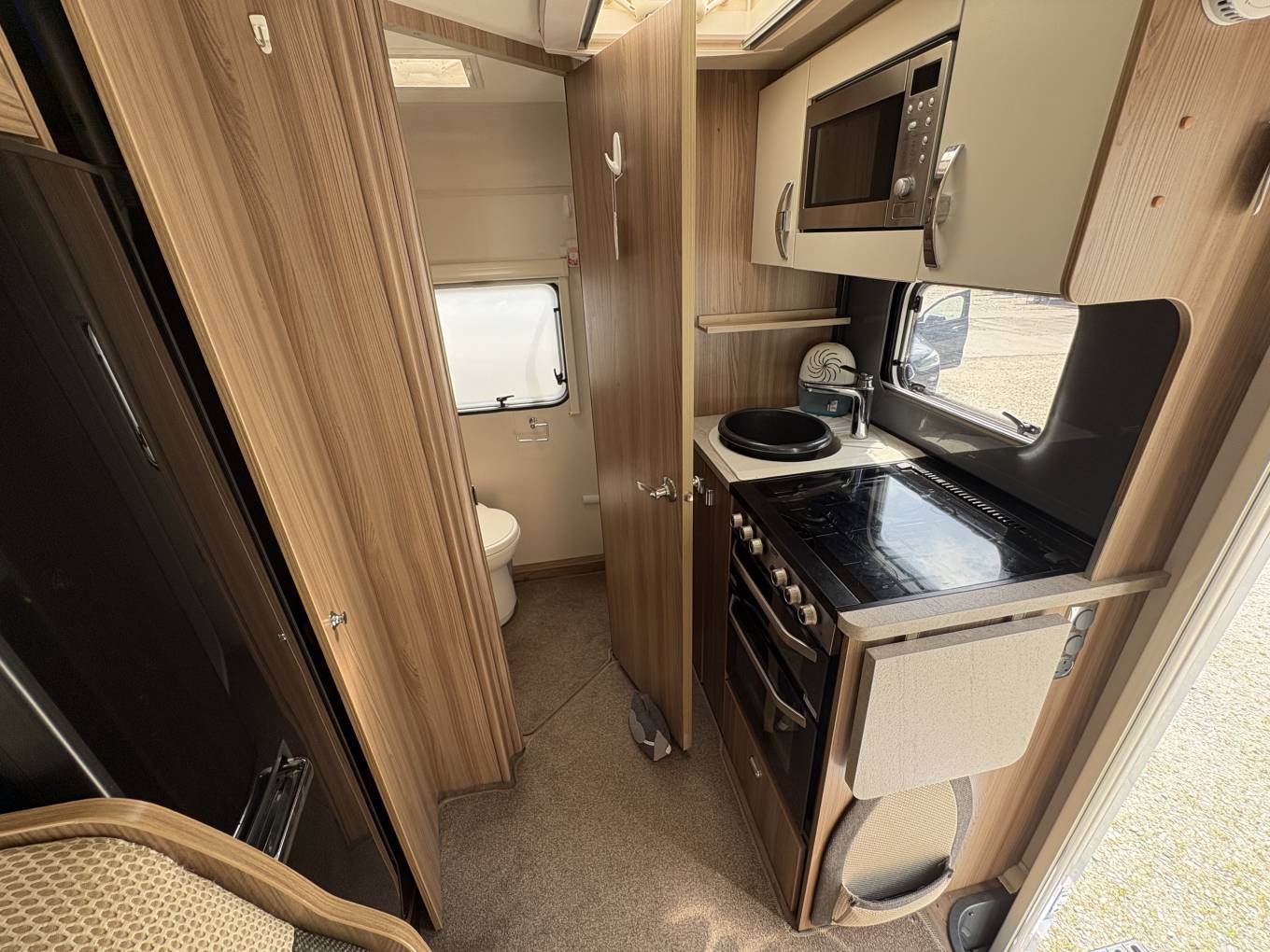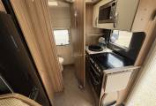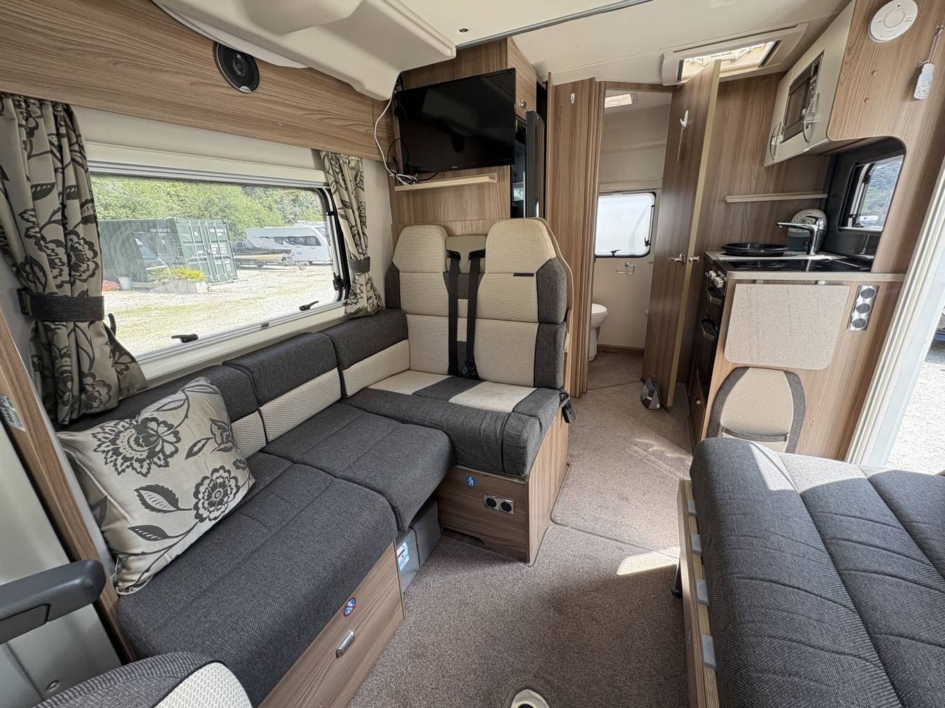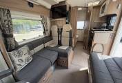 Layout - Full washroom at the rear with a separate shower cubicle and storage space you can access from outside the van aswell, the kitchen consists of 3 gas hobs, 1 electric plate, separate oven and grill, microwave, large modern frisge with freezer space. You have plenty of storage throughout the van and this includes a second large wardrobe next to the fridge. The lounge is smart and sleek and you can travel 2 more people here and this area is home to a TV and a large electric drop down bed. The lounge area does convert into a sleeping area aswell.