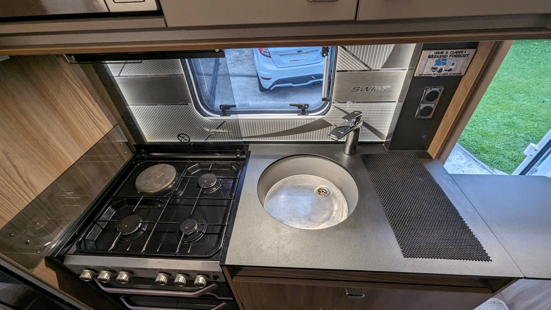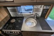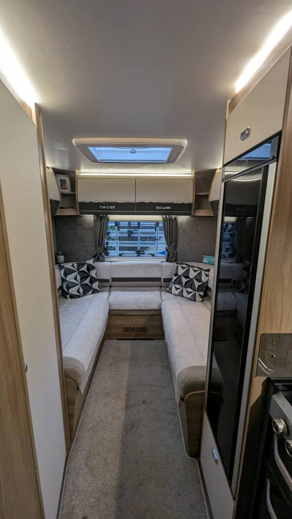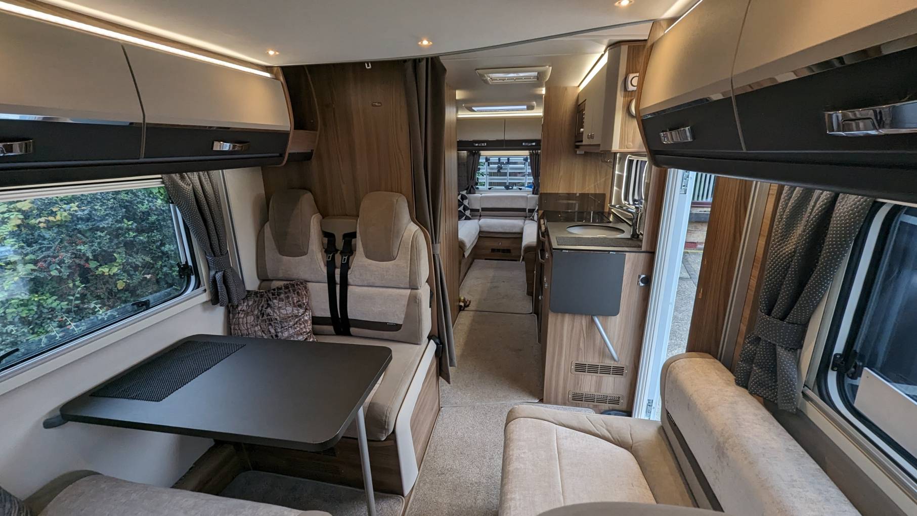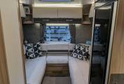 Sleeping options are flexible, with a centre dinette that converts into a double bed, a large rear U-shaped lounge that also makes into a double, and an electric drop-down bed above the lounge, making this a genuine six berth layout. It's a comfortable and versatile space whether travelling as a couple or with family.