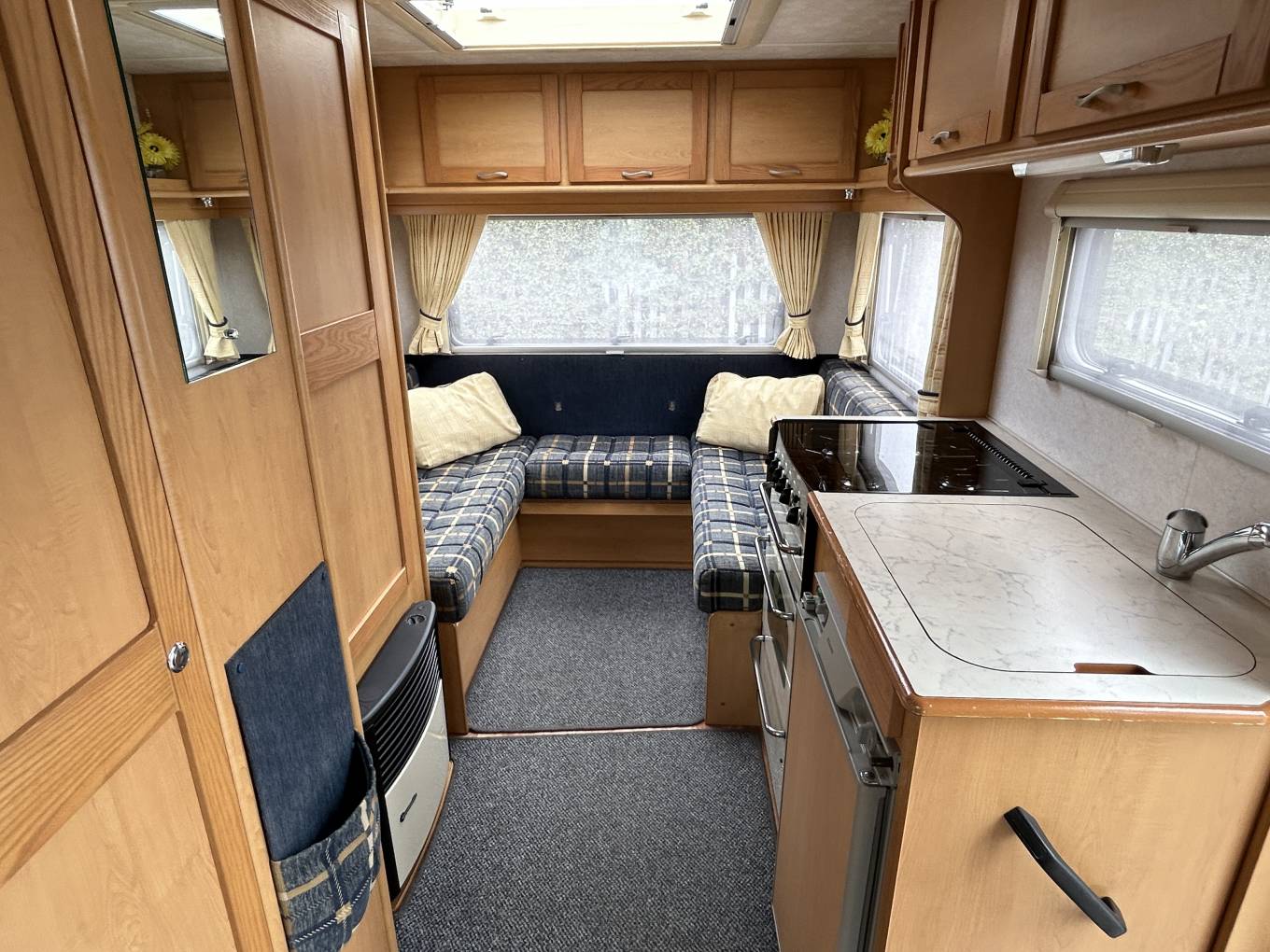 This Sunseeker comes with excellent extras, including a free full motorhome cover worth £500, two deck chairs, silver screen covers, and a microwave. It also features a tow bar, gas heating, gas and electric hot water, and a passenger swivel seat for added comfort. It’s a 4-berth with 2 seat belts and, with a gross weight of just 3400 kg, it can be driven on a standard UK driving licence.