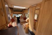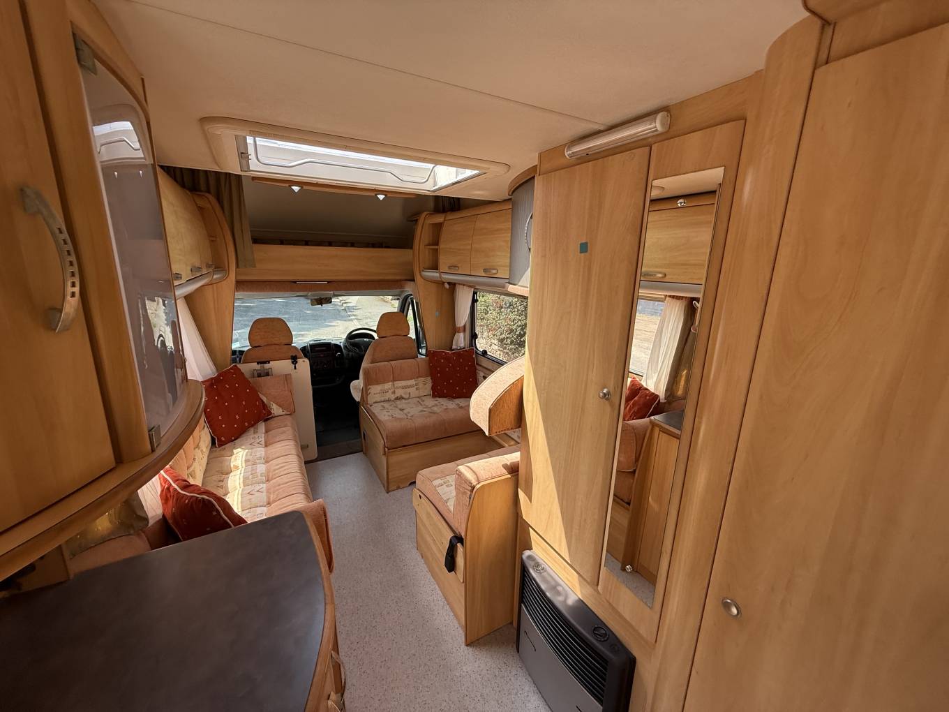 At the rear of the motorhome you will find the well equipped kitchen area which includes a 4 x gas hob, grill, sink with mixer tap and drainer, fridge with freezer compartment and plenty of storage. Moving forward you will find the practical washroom complete with shower, Thetford toilet with electric flush, wash basin, vanity storage and a large mirror. In the heart of the motorhome is the light and airy dinette area. With a removable table and plenty of room for 6 to dine comfortably this is the perfect place to entertain or to sit and relax. As the night draws in this area quickly and conveniently converts in to a comfortable double and single bed. Finally there is a good sized overcab double bed completing this 5 berth motorhome. Throughout this motorhome there is bags of storage including overhead lockers, a large wardrobe and drinks cabinet.